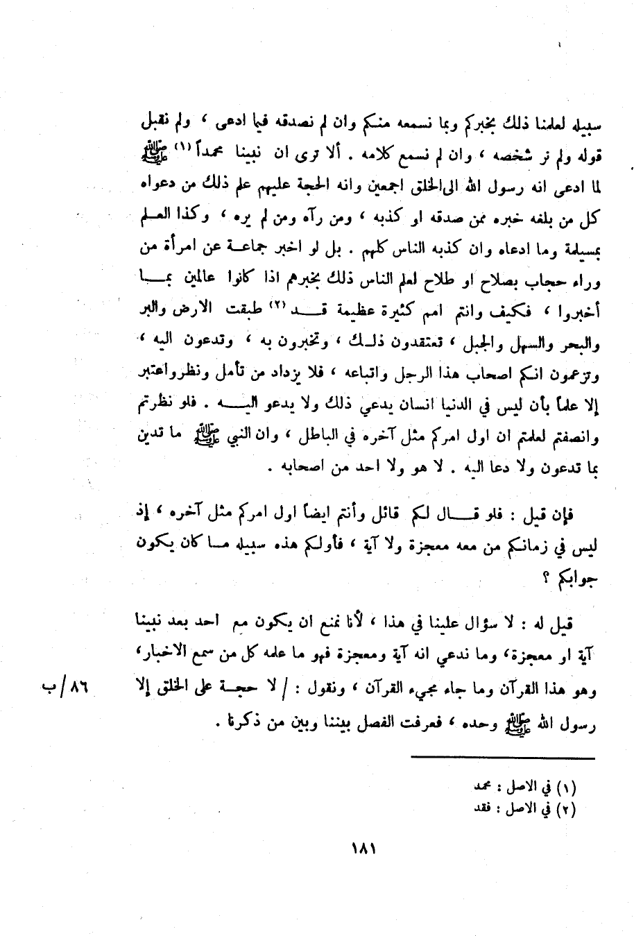 قيل له: لا سؤال علينا في هذا، لأنا نمنع ان يكون مع احد بعد نبينا آية او معجزة، وما ندعي انه آية ومعجزة فهو ما علمه كل من سمع الاخبار، وهو هذا القرآن وما جاء مجيء القرآن، ونقول: / لا حجة على الخلق إلا رسول الله صلّى الله عليه وسلم وحده، فعرفت الفصل بيننا وبين من ذكرنا.