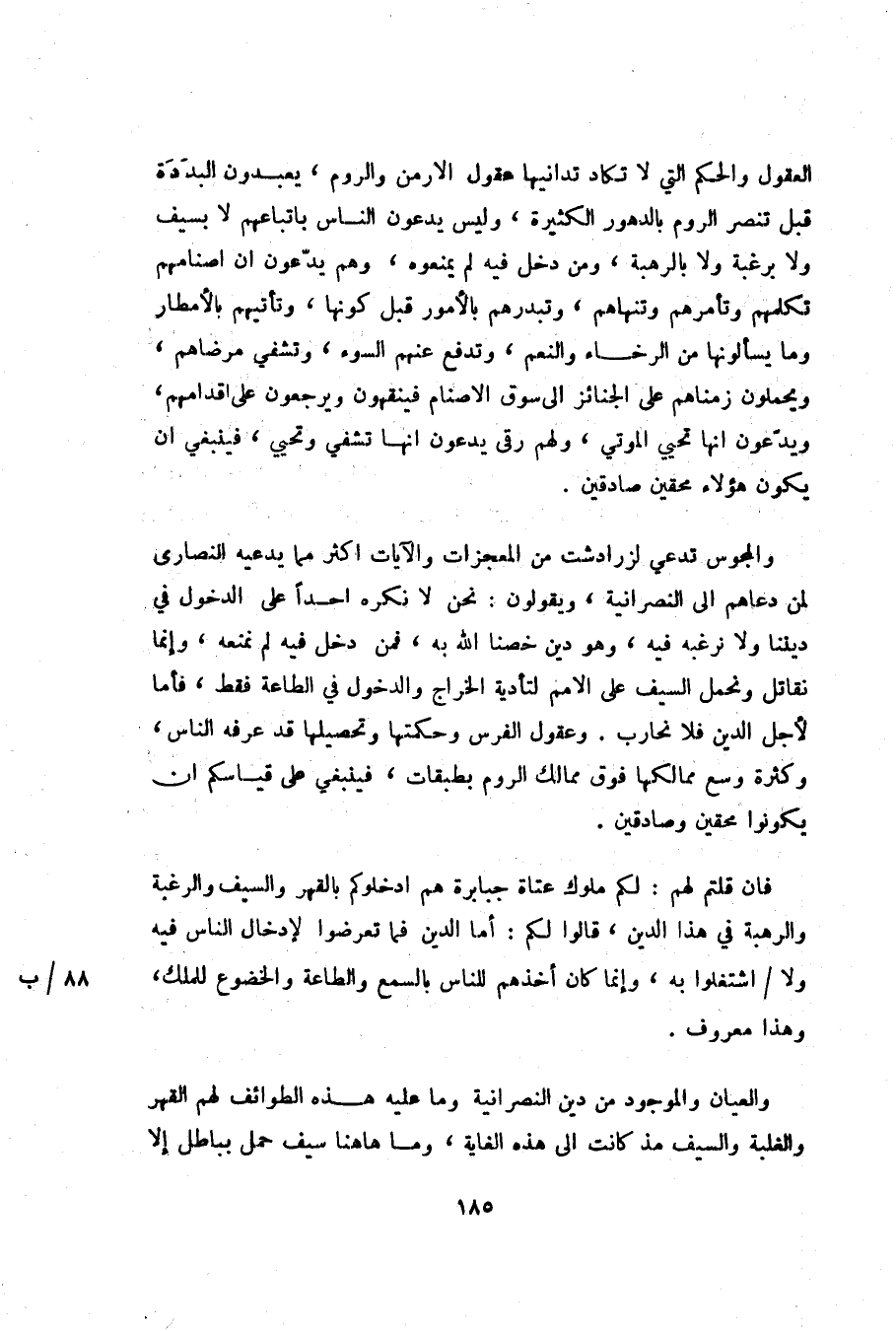 والمجوس تدعي لزرادشت من المعجزات والآيات اكثر مما يدعيه النصارى لمن دعاهم الى النصرانية، ويقولون: نحن لا نكره احدا على الدخول في ديننا ولا نرغبه فيه، وهو دين خصنا الله به، فمن دخل فيه لم نمنعه، وإنما نقاتل ونحمل السيف على الامم لتأدية الخراج والدخول في الطاعة فقط، فأما لأجل الدين فلا نحارب. وعقول الفرس وحكمتها وتحصيلها قد عرفه الناس، وكثرة وسع ممالكها فوق ممالك الروم بطبقات، فينبغي على قياسكم ان يكونوا محقين وصادقين.