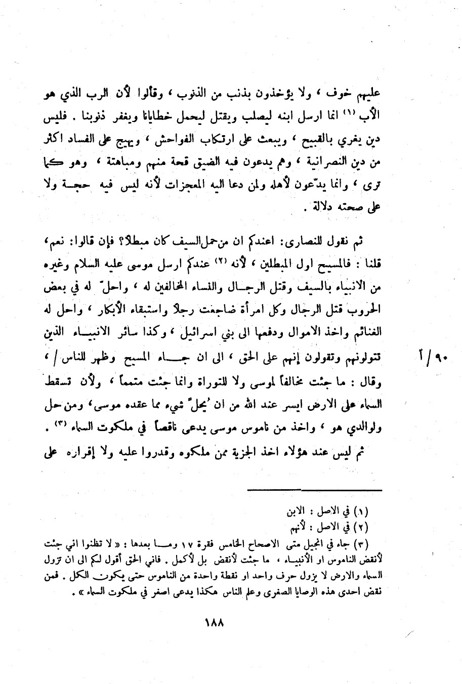 (3) جاء في انجيل متى الاصحاح الخامس فقرة 17 وما بعدها: «لا تظنوا اني جئت لأنقض الناموس او الأنبياء، ما جئت لأنقض بل لأكمل. فاني الحق أقول لكم الى ان تزول السماء والارض لا يزول حرف واحد او نقطة واحدة من الناموس حتى يكون الكل. فمن نقض احدى هذه الوصايا الصغرى وعلم الناس هكذا يدعى اصغر في ملكوت السماء» .
