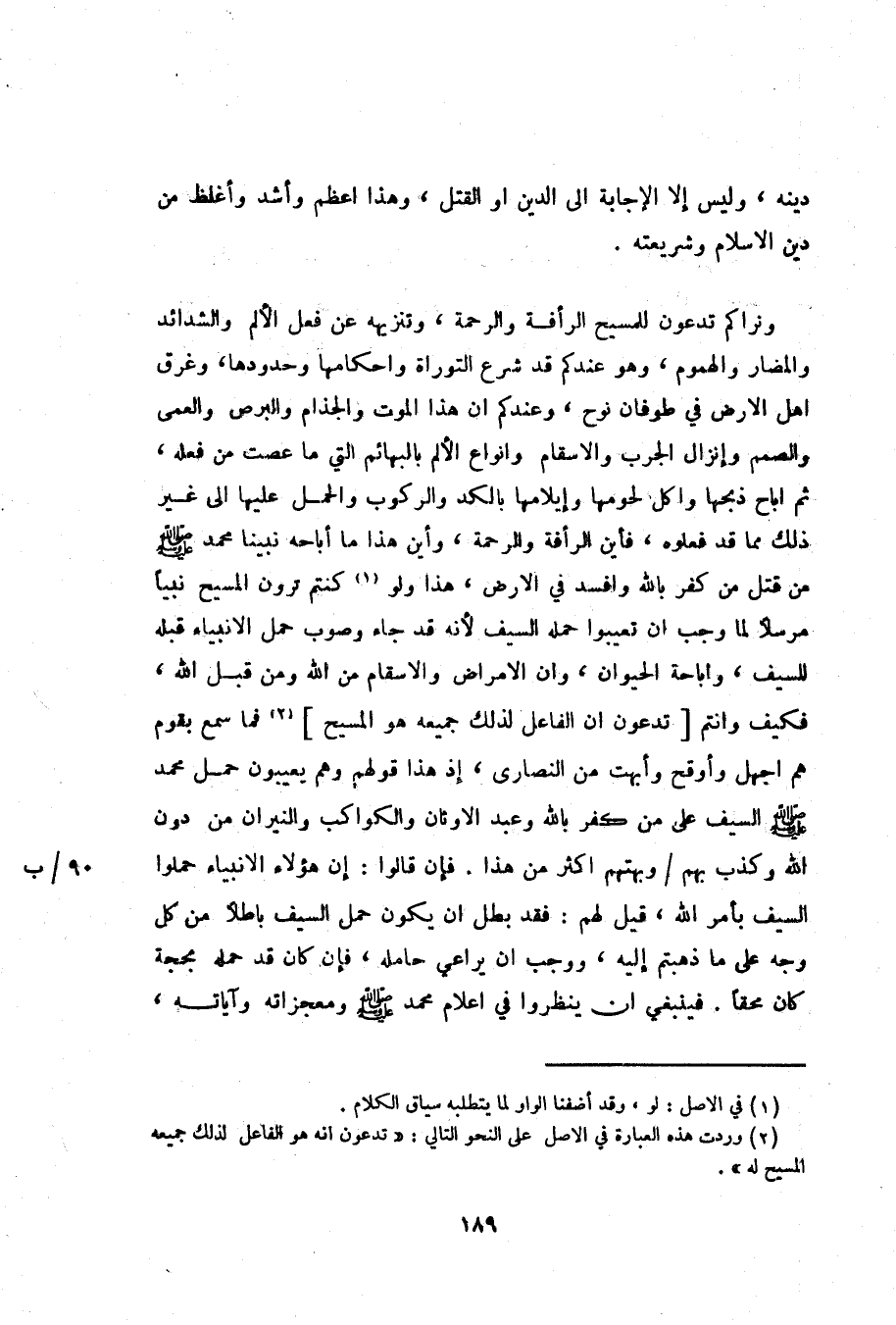 ونراكم تدعون للمسيح الرأفة والرحمة، وتنزيهه عن فعل الألم والشدائد والمضار والهموم، وهو عندكم قد شرع التوراة واحكامها وحدودها، وغرق اهل الارض في طوفان نوح، وعندكم ان هذا الموت والجذام والبرص والعمى والصمم وإنزال الجرب والاسقام وانواع الألم بالبهائم التي ما عصت من فعله، ثم اباح ذبحها واكل لحومها وإيلامها بالكد والركوب والحمل عليها الى غير ذلك مما قد فعلوه، فأين الرأفة والرحمة، وأين هذا ما أباحه نبينا محمد صلّى الله عليه وسلم من قتل من كفر بالله وافسد في الارض، هذا ولو «1» كنتم ترون المسيح نبيا مرسلا لما وجب ان تعيبوا حمله السيف لأنه قد جاء وصوب حمل الانبياء قبله للسيف، واباحة الحيوان، وان الامراض والاسقام من الله ومن قبل الله، فكيف وانتم [تدعون ان الفاعل لذلك جميعه هو المسيح] «2» فما سمع بقوم هم اجهل وأوقح وأبهت من النصارى، إذ هذا قولهم وهم يعيبون حمل محمد صلّى الله عليه وسلم السيف على من كفر بالله وعبد الاوثان والكواكب والنيران من دون الله وكذب بهم/ وبهتهم اكثر من هذا. فإن قالوا: إن هؤلاء الانبياء حملوا السيف بأمر الله، قيل لهم: فقد بطل ان يكون حمل السيف باطلا من كل وجه على ما ذهبتم إليه، ووجب ان يراعي حامله، فإن كان قد حمله بحجة كان محقا. فينبغي ان ينظروا في اعلام محمد صلّى الله عليه وسلم ومعجزاته وآياته،