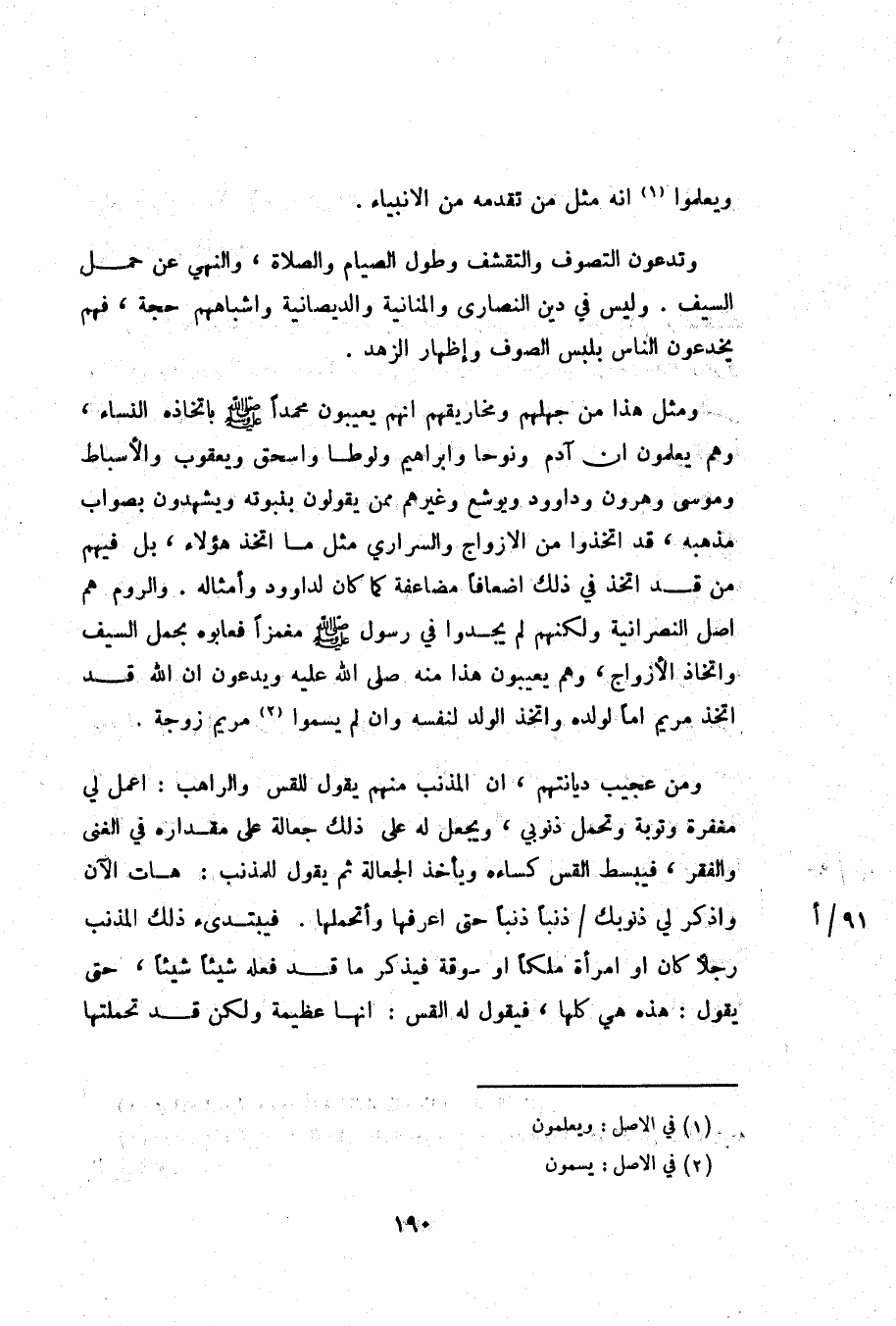 ومثل هذا من جهلهم ومخاريقهم انهم يعيبون محمدا صلّى الله عليه وسلم باتخاذه النساء، وهم يعلمون ان آدم ونوحا وابراهيم ولوطا واسحق ويعقوب والأسباط وموسى وهرون وداود ويوشع وغيرهم ممن يقولون بنبوته ويشهدون بصواب مذهبه، قد اتخذوا من الازواج والسراري مثل ما اتخذ هؤلاء، بل فيهم من قد اتخذ في ذلك اضعافا مضاعفة كما كان لداود وأمثاله. والروم هم اصل النصرانية ولكنهم لم يجدوا في رسول صلّى الله عليه وسلم مغمزا فعابوه بحمل السيف واتخاذ الأزواج، وهم يعيبون هذا منه صلى الله عليه ويدعون ان الله قد اتخذ مريم اما لولده واتخذ الولد لنفسه وان لم يسموا «2» مريم زوجة.