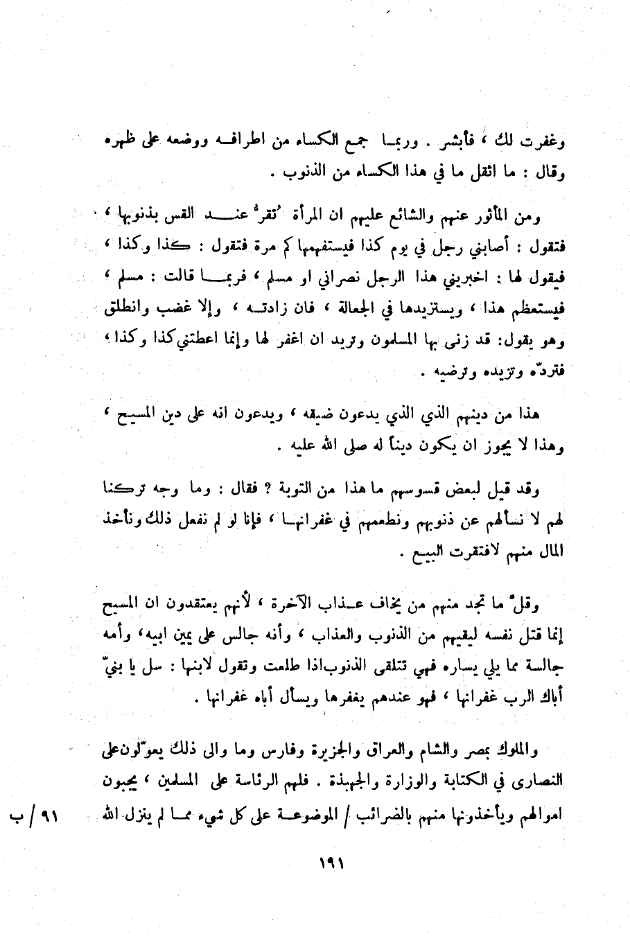 ومن المأثور عنهم والشائع عليهم ان المرأة تقرّ عند القس بذنوبها، فتقول: أصابني رجل في يوم كذا فيستفهمها كم مرة فتقول: كذا وكذا، فيقول لها: اخبريني هذا الرجل نصراني او مسلم، فربما قالت: مسلم، فيستعظم هذا، ويستزيدها في الجعالة، فان زادته، وإلا غضب وانطلق وهو يقول: قد زنى بها المسلمون وتريد ان اغفر لها وإنما اعطتني كذا وكذا، فتردّه وتزيده وترضيه.