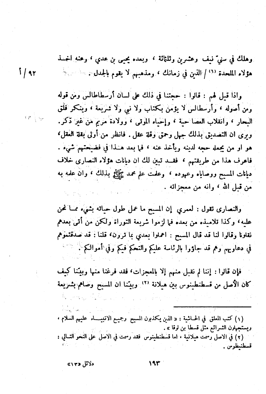 (1) كتب المعلق في الحاشية: «الذين يكذبون المسيح وجميع الانبياء عليهم السلام، ويستجهلون الشرائع مثل قسطا بن لوقا» .