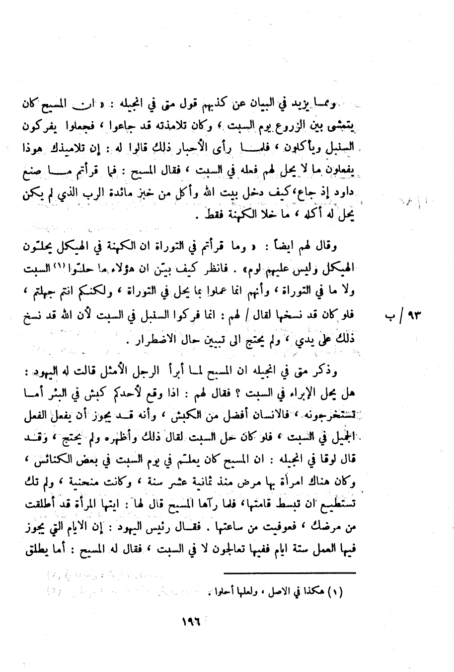 وقال لهم ايضا: «وما قرأتم في التوراة ان الكهنة في الهيكل يحلّون الهيكل وليس عليهم لوم» . فانظر كيف بيّن ان هؤلاء ما حلّوا «1» السبت ولا ما في التوراة، وأنهم انما عملوا بما يحل في التوراة، ولكنكم انتم جهلتم، فلو كان قد نسخها لقال/ لهم: انما فركوا السنبل في السبت لأن الله قد نسخ ذلك على يدي، ولم يحتج الى تبيين حال الاضطرار.