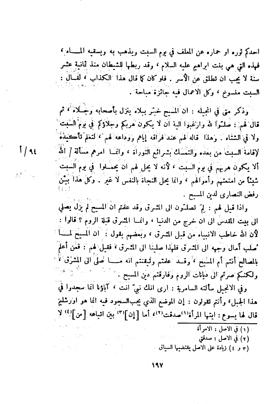 وفي الانجيل سألته السامرية: ارى انك نبيّ انت، آباؤنا انما سجدوا في هذا الجبل، وأنتم تقولون: إن الموضع الذي يجب السجود فيه انما هو اورشليم قال لها يسوع: ايتها المرأة «1» صدقت «2» ، أما [إن] «3» بين اتباعه [من] «4» لا