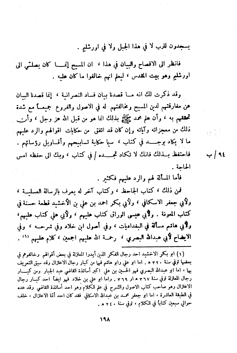 فمن ذلك، كتاب الجاحظ، وكتاب آخر له يعرف بالرسالة العسلية، ولأبي جعفر الاسكافي، ولأبي بكر احمد بن علي بن الأخشيد قطعة حسنة في كتاب المعونة. ولأبي عيسى الوراق كتاب عليهم، ولأبي علي كتاب عليهم، ولأبي هاشم مسألة في البغداديات، وفي أصول ابن خلاد وفي شرحه، وفي الايضاح لأبي عبد الله البصري، رحمة الله عليهم اجمعين، كلام عليهم «1» .