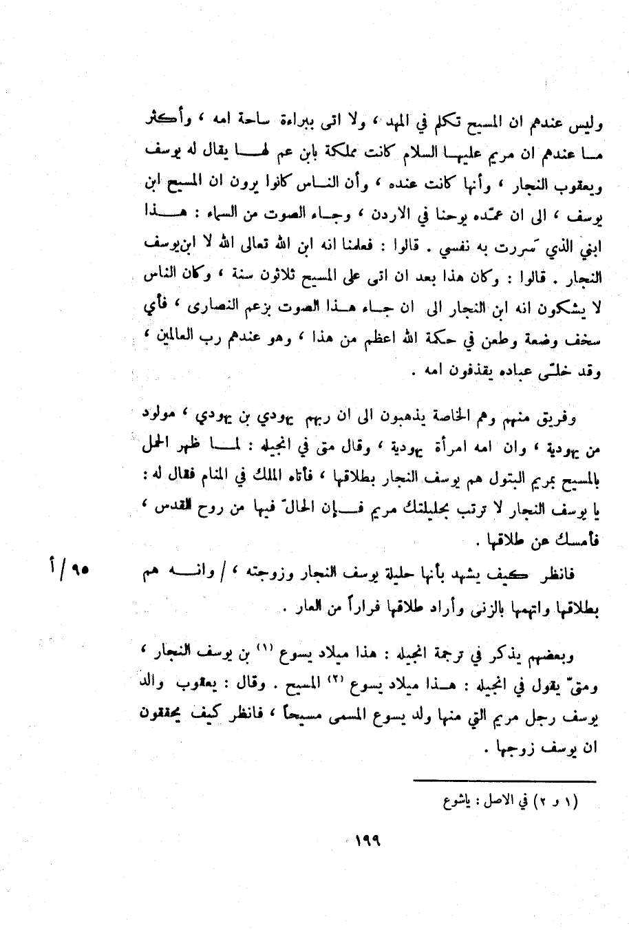 وفريق منهم وهم الخاصة يذهبون الى ان ربهم يهودي بن يهودي، مولود من يهودية، وان امه امرأة يهودية، وقال متى في انجيله: لما ظهر الحمل بالمسيح بمريم البتول هم يوسف النجار بطلاقها، فأتاه الملك في المنام فقال له: