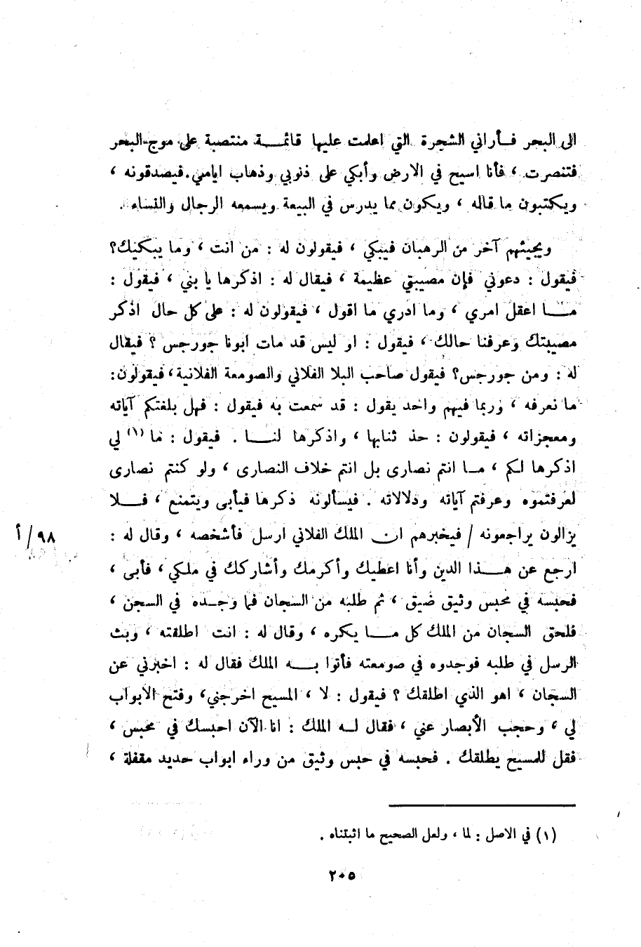 الى البحر فأراني الشجرة التي اعلمت عليها قائمة منتصبة على موج البحر فتنصرت، فأنا اسيح في الارض وأبكي على ذنوبي وذهاب ايامي. فيصدقونه، ويكتبون ما قاله، ويكون مما يدرس في البيعة ويسمعه الرجال والنساء.
