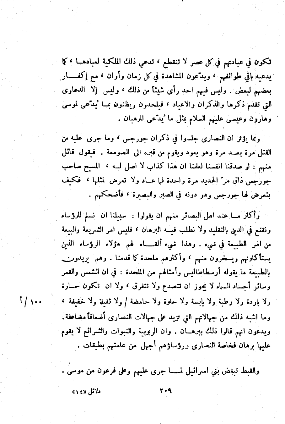 وأكثر ما عند اهل البصائر منهم ان يقولوا: سبيلنا ان نسلم للرؤساء ونقنع في الدين بالتقليد ولا نطلب فيه البرهان، فليس امر الشريعة والبيعة من امر الطبيعة في شيء. وهذا شيء ألقاه لهم هؤلاء الرؤساء الذين يستأكلونهم ويسخرون منهم، وأكثرهم ملحدة كما قدمنا. وهم يريدون بالطبيعة ما يقوله أرسطاطاليس وأمثالهم من الملحدة: في ان الشمس والقمر وسائر أجساد السماء لا يجوز ان تتصدع ولا تتفرق، ولا ان تكون حارة ولا باردة ولا رطبة ولا يابسة ولا حلوة ولا حامضة/ ولا ثقيلة ولا خفيفة، وما اشبه ذلك من جهالاتهم التي تزيد على جهالات النصارى أضعافا مضاعفة.