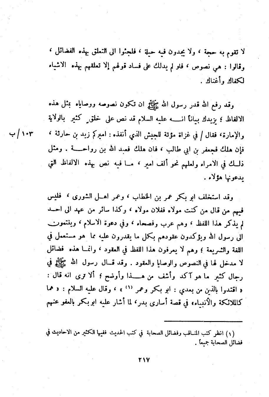 وقد استخلف ابو بكر عمر بن الخطاب، وعمر اهل الشورى، فليس فيهم من قال من كنت مولاه ففلان مولاه، وكذا سائر من عهد الى احد لم يذكر هذا اللفظ، وهم عرب وفصحاء، وفي دعوة الاسلام، وينتمون الى رسول الله ويؤكدون عقودهم بكل ما يقدرون عليه مما هو مستعمل في اللغة والشريعة؛ وهم لا يعرفون هذا اللفظ في العقود، وانما هذه فضائل لا مدخل لها في النصوص والوصايا والعقود. وقد قال رسول الله صلّى الله عليه وسلم في رجال كثير ما هو آكد وأشف من هذا وأوضح؛ ألا ترى انه قال: