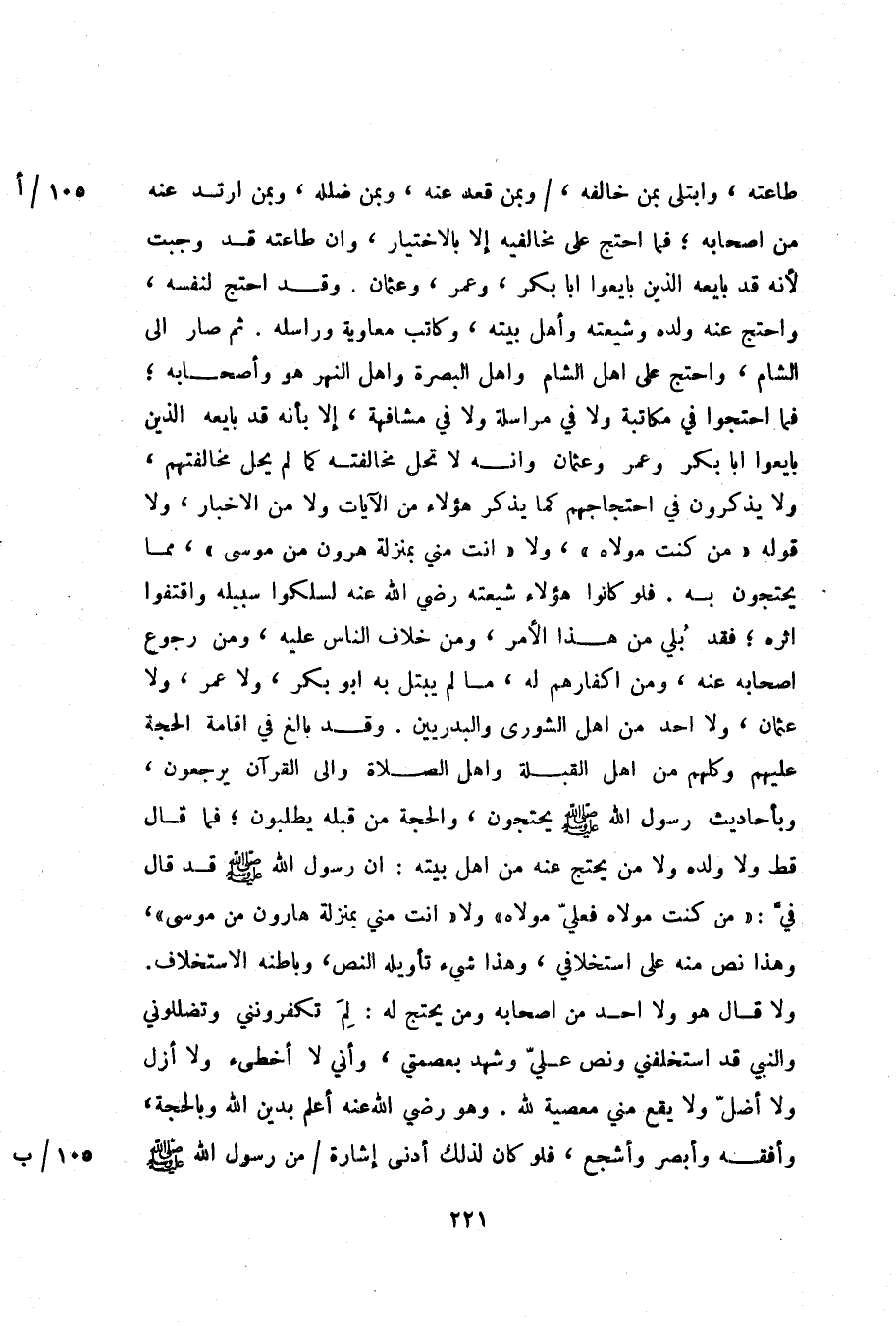ولا قال هو ولا احد من اصحابه ومن يحتج له: لم تكفرونني وتضللوني والنبي قد استخلفني ونص عليّ وشهد بعصمتي، وأني لا أخطىء ولا أزل ولا أضلّ ولا يقع مني معصية لله. وهو رضي الله عنه أعلم بدين الله وبالحجة، وأفقه وأبصر وأشجع، فلو كان لذلك أدنى إشارة/ من رسول الله صلّى الله عليه وسلم
