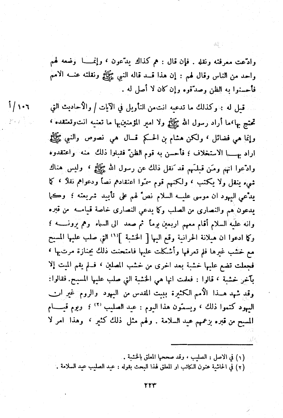 قيل له: وكذلك ما تدعيه انت من التأويل في الآيات/ والأحاديث التي تحتج بها، ما أراد رسول الله صلّى الله عليه وسلم ولا امير المؤمنين بها ما تعنيه انت وتعتقده، وإنما هي فضائل، ولكن هشام بن الحكم قال هي نصوص والنبي صلّى الله عليه وسلم اراد بها الاستخلاف؛ فأحسن به قوم الظنّ فقبلوا ذلك منه واعتقدوه وادّعوا انهم ومن قبلهم قد نقل ذلك عن رسول الله صلّى الله عليه وسلم، وليس هناك شيء ينقل ولا يكتب، ولكنهم قوم سمّوا اعتقادهم نصا ودعواهم نقلا، كما يدّعي اليهود ان موسى عليه السلام نصّ لهم على تأييد شريعته؛ وكما يدعون هم والنصارى من الصلب وكما يدعي النصارى خاصة قيامه من قبره وانه عليه السلام أقام معهم اربعين يوما ثم صعد الى السماء وهم يرونه؛ وكما ادعوا ان هيلانة الحرانية وقع اليها [الخشبة] «1» التي صلب عليها المسيح مع خشب غيرها فلم تعرفها وأشكلت عليها فامتحنت ذلك بجنازة مرت بها، فجعلت تضع عليها خشبة بعد اخرى من خشب المصلين، فلم يقم الميت إلا باخر خشبة، قالوا: فعلمت انها هي الخشبة التي صلب عليها المسيح. فقالوا: