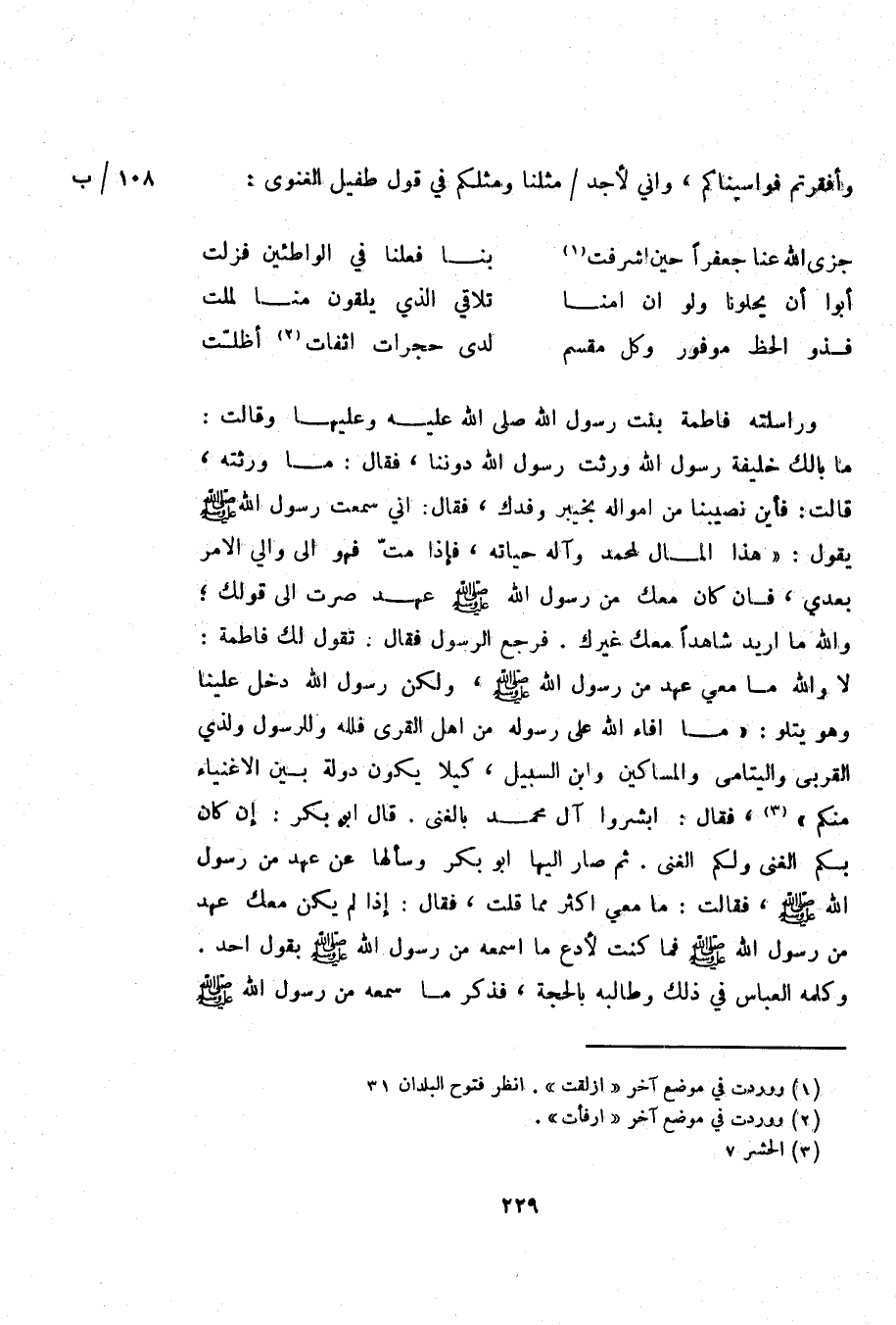 لا والله ما معي عهد من رسول الله صلّى الله عليه وسلم، ولكن رسول الله دخل علينا وهو يتلو: «ما أَفاءَ اللَّهُ عَلى رَسُولِهِ مِنْ أَهْلِ الْقُرى فَلِلَّهِ وَلِلرَّسُولِ وَلِذِي الْقُرْبى وَالْيَتامى وَالْمَساكِينِ وَابْنِ السَّبِيلِ، كَيْ لا يَكُونَ دُولَةً بَيْنَ الْأَغْنِياءِ مِنْكُمْ» «3» ، فقال: ابشروا آل محمد بالغنى. قال ابو بكر: إن كان بكم الغنى ولكم الغنى. ثم صار اليها ابو بكر وسألها عن عهد من رسول الله صلّى الله عليه وسلم، فقالت: ما معي اكثر مما قلت، فقال: إذا لم يكن معك عهد من رسول الله صلّى الله عليه وسلم فما كنت لأدع ما اسمعه من رسول الله صلّى الله عليه وسلم بقول احد.