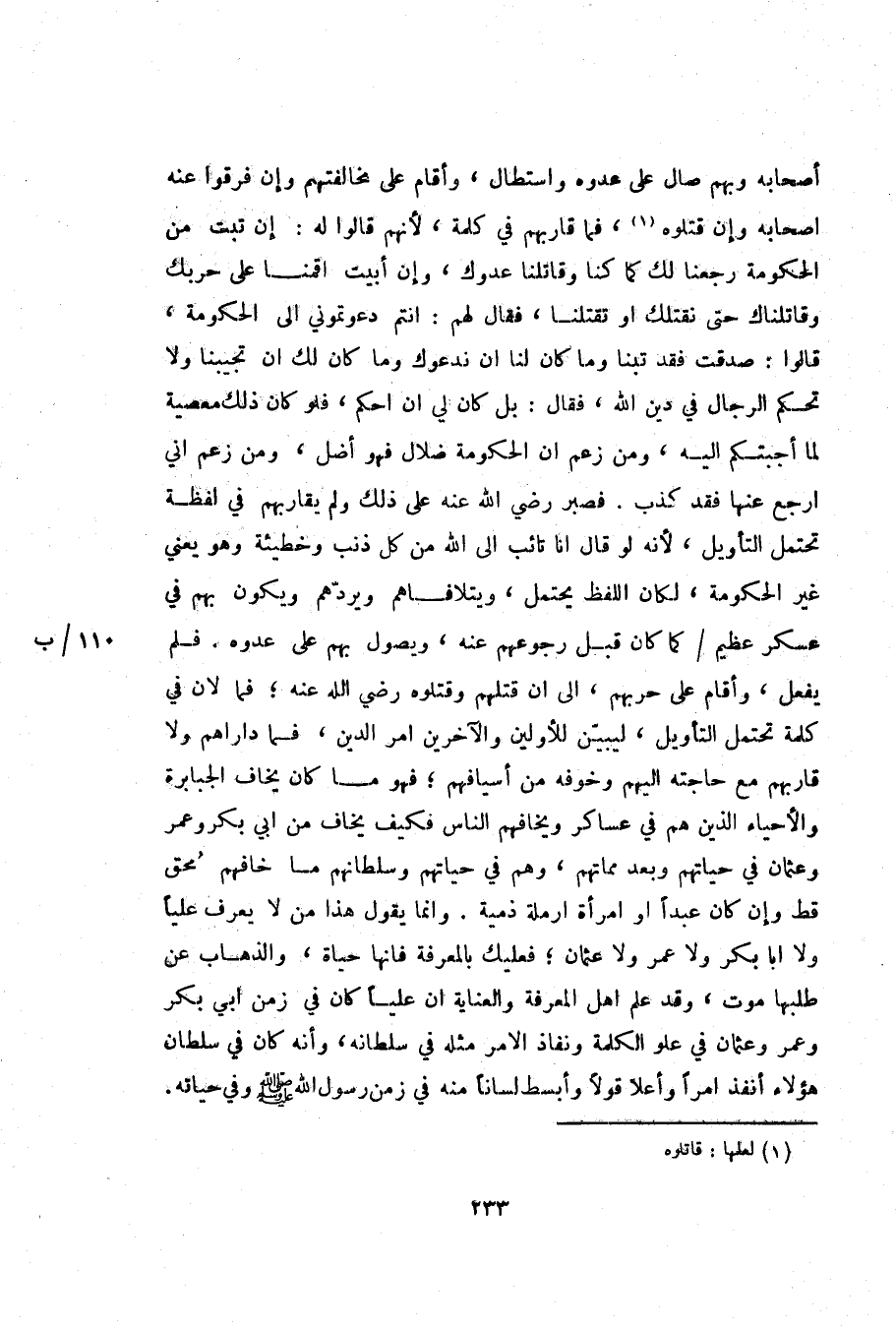 أصحابه وبهم صال على عدوه واستطال، وأقام على مخالفتهم وإن فرقوا عنه اصحابه وإن قتلوه «1» ، فما قاربهم في كلمة، لأنهم قالوا له: إن تبت من الحكومة رجعنا لك كما كنا وقاتلنا عدوك، وإن أبيت اقمنا على حربك وقاتلناك حتى نقتلك او تقتلنا، فقال لهم: انتم دعوتموني الى الحكومة، قالوا: صدقت فقد تبنا وما كان لنا ان ندعوك وما كان لك ان تجيبنا ولا تحكم الرجال في دين الله، فقال: بل كان لي ان احكم، فلو كان ذلك معصية لما أجبتكم اليه، ومن زعم ان الحكومة ضلال فهو أضل، ومن زعم اني ارجع عنها فقد كذب. فصبر رضي الله عنه على ذلك ولم يقاربهم في لفظة تحتمل التأويل، لأنه لو قال انا تائب الى الله من كل ذنب وخطيئة وهو يعني غير الحكومة، لكان اللفظ يحتمل، ويتلافاهم ويردّهم ويكون بهم في عسكر عظيم/ كما كان قبل رجوعهم عنه، ويصول بهم على عدوه. فلم يفعل، وأقام على حربهم، الى ان قتلهم وقتلوه رضي الله عنه؛ فما لان في كلمة تحتمل التأويل، ليبيّن للأولين والآخرين امر الدين، فما داراهم ولا قاربهم مع حاجته اليهم وخوفه من أسيافهم؛ فهو ما كان يخاف الجبابرة والأحياء الذين هم في عساكر ويخافهم الناس فكيف يخاف من ابي بكر وعمر وعثمان في حياتهم وبعد مماتهم، وهم في حياتهم وسلطانهم ما خافهم محق قط وإن كان عبدا او امرأة ارملة ذمية. وانما يقول هذا من لا يعرف عليا ولا ابا بكر ولا عمر ولا عثمان؛ فعليك بالمعرفة فانها حياة، والذهاب عن طلبها موت، وقد علم اهل المعرفة والعناية ان عليا كان في زمن ابي بكر وعمر وعثمان في علو الكلمة ونفاذ الامر مثله في سلطانه، وأنه كان في سلطان هؤلاء أنفذ امرا وأعلا قولا وأبسط لسانا منه في زمن رسول الله صلّى الله عليه وسلم وفي حياته.