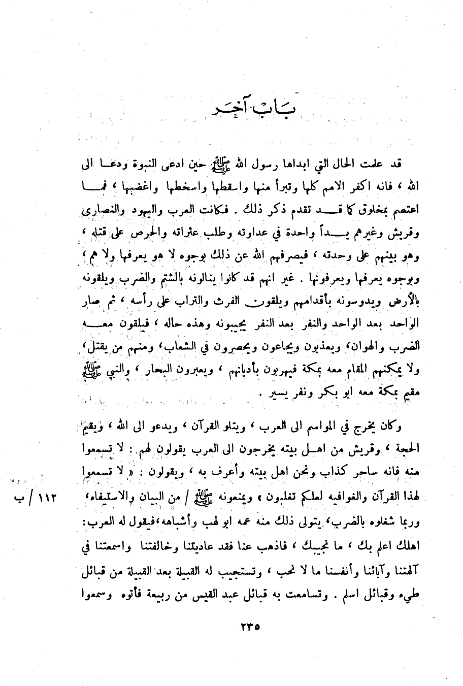 قد علمت الحال التي ابداها رسول الله صلّى الله عليه وسلم حين ادعى النبوة ودعا الى الله، فانه اكفر الامم كلها وتبرأ منها واسقطها واسخطها واغضبها، فما اعتصم بمخلوق كما قد تقدم ذكر ذلك. فكانت العرب واليهود والنصارى وقريش وغيرهم يدا واحدة في عداوته وطلب عثراته والحرص على قتله، وهو بينهم على وحدته، فيصرفهم الله عن ذلك بوجوه لا هو يعرفها ولا هم، وبوجوه يعرفها ويعرفونها. غير انهم قد كانوا ينالونه بالشتم والضرب ويلقونه بالأرض ويدوسونه بأقدامهم ويلقون الفرث والتراب على رأسه، ثم صار الواحد بعد الواحد والنفر بعد النفر يجيبونه وهذه حاله، فيلقون معه الضرب والهوان، ويعذبون ويجاعون ويحصرون في الشعاب، ومنهم من يقتل، ولا يمكنهم المقام معه بمكة فيهربون بأديانهم، ويعبرون البحار، والنبي صلّى الله عليه وسلم مقيم بمكة معه ابو بكر ونفر يسير.