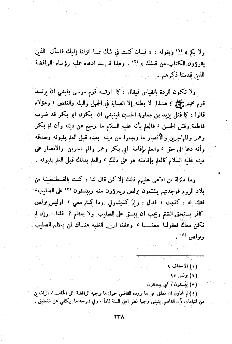 (4) لم نحاول ان نعلق على ما يورده القاضي حول ما يوجهه الرافضة الى الخلفاء الراشدين من اتهامات لأن القاضي يتبنى وجهة نظر اهل السنة تماما، وفي شرحه ما يكفي عن التعليق.