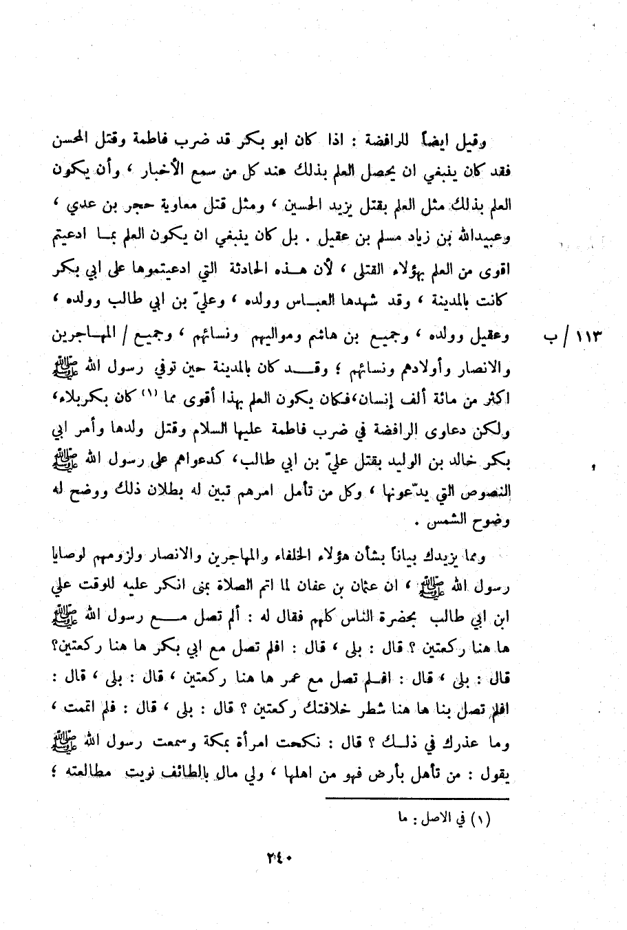 وقيل ايضا للرافضة: اذا كان ابو بكر قد ضرب فاطمة وقتل المحسن فقد كان ينبغي ان يحصل العلم بذلك عند كل من سمع الأخبار، وأن يكون العلم بذلك مثل العلم بقتل يزيد الحسين، ومثل قتل معاوية حجر بن عدي، وعبيد الله بن زياد مسلم بن عقيل. بل كان ينبغي ان يكون العلم بما ادعيتم اقوى من العلم بهؤلاء القتلى، لأن هذه الحادثة التي ادعيتموها على ابي بكر كانت بالمدينة، وقد شهدها العباس وولده، وعليّ بن ابي طالب وولده، وعقيل وولده، وجميع بن هاشم ومواليهم ونسائهم، وجميع/ المهاجرين والانصار وأولادهم ونسائهم؛ وقد كان بالمدينة حين توفي رسول الله صلّى الله عليه وسلم اكثر من مائة ألف إنسان، فكان يكون العلم بهذا أقوى مما «1» كان بكربلاء، ولكن دعاوى الرافضة في ضرب فاطمة عليها السلام وقتل ولدها وأمر ابي بكر خالد بن الوليد بقتل عليّ بن ابي طالب، كدعواهم على رسول الله صلّى الله عليه وسلم النصوص التي يدّعونها، وكل من تأمل امرهم تبين له بطلان ذلك ووضح له وضوح الشمس.