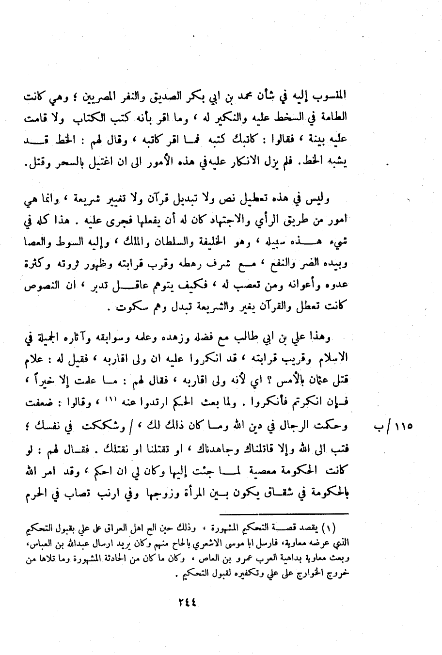وليس في هذه تعطيل نص ولا تبديل قرآن ولا تغيير شريعة، وانما هي امور من طريق الرأي والاجتهاد كان له أن يفعلها فجرى عليه. هذا كله في شيء هذه سبيله، وهو الخليفة والسلطان والملك، وإليه السوط والعصا وبيده الضر والنفع، مع شرف رهطه وقرب قرابته وظهور ثروته وكثرة عدوه وأعوانه ومن تعصب له، فكيف يتوهم عاقل تدبر، ان النصوص كانت تعطل والقرآن يغير والشريعة تبدل وهم سكوت.