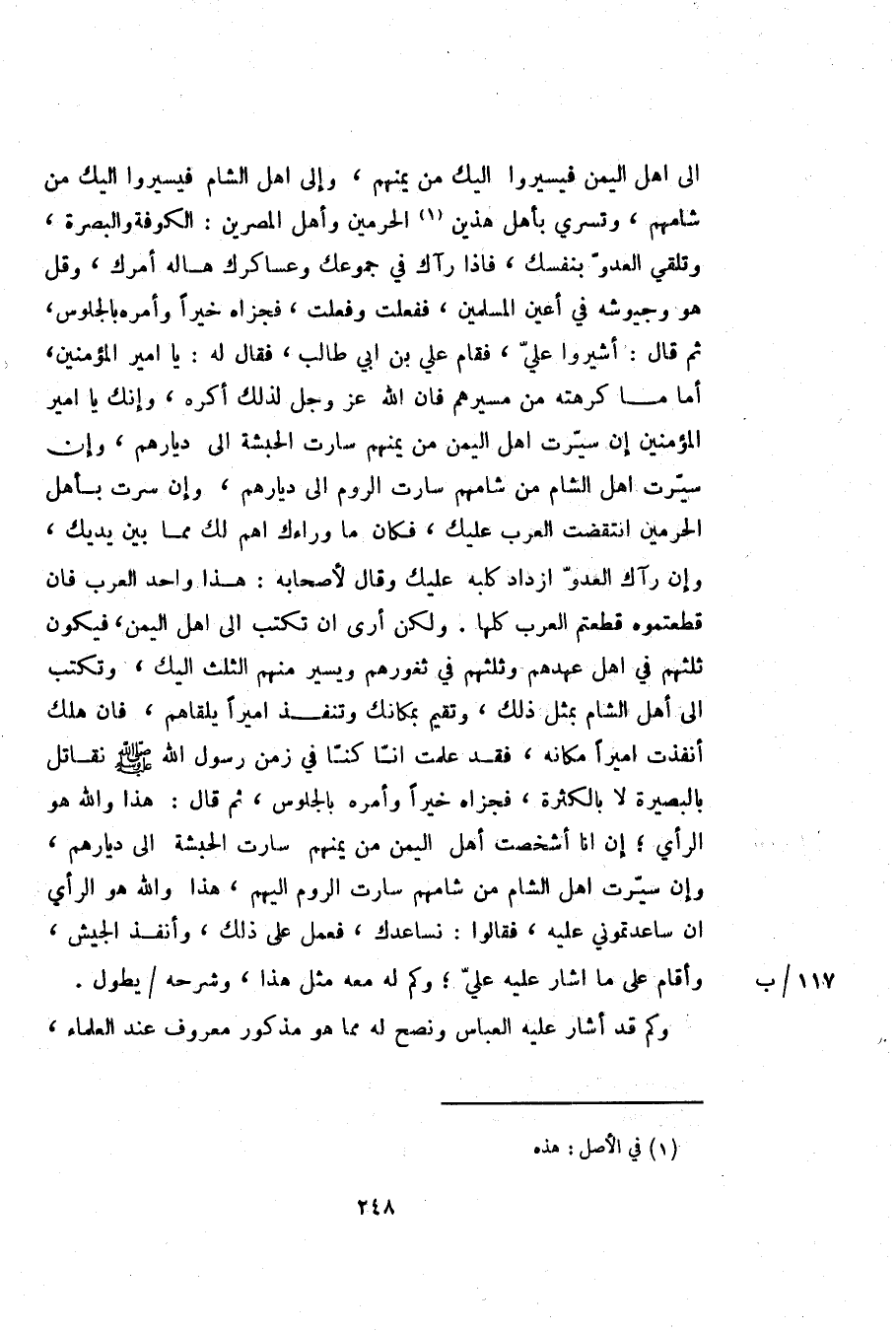 الى اهل اليمن فيسيروا اليك من يمنهم، وإلى اهل الشام فيسيروا اليك من شامهم، وتسري بأهل هذين «1» الحرمين وأهل المصرين: الكوفة والبصرة، وتلقي العدوّ بنفسك، فاذا رآك في جموعك وعساكرك هاله أمرك، وقل هو وجيوشه في أعين المسلمين، ففعلت وفعلت، فجزاه خيرا وأمره بالجلوس، ثم قال: أشيروا عليّ، فقام علي بن ابي طالب، فقال له: يا امير المؤمنين، أما ما كرهته من مسيرهم فان الله عز وجل لذلك أكره، وإنك يا امير المؤمنين إن سيّرت اهل اليمن من يمنهم سارت الحبشة الى ديارهم، وإن سيّرت اهل الشام من شامهم سارت الروم الى ديارهم، وإن سرت بأهل الحرمين انتقضت العرب عليك، فكان ما وراءك اهم لك مما بين يديك، وإن رآك العدوّ ازداد كلبه عليك وقال لأصحابه: هذا واحد العرب فان قطعتموه قطعتم العرب كلها. ولكن أرى ان تكتب الى اهل اليمن، فيكون ثلثهم في اهل عهدهم وثلثهم في ثغورهم ويسير منهم الثلث اليك، وتكتب الى أهل الشام بمثل ذلك، وتقيم بمكانك وتنفذ اميرا يلقاهم، فان هلك أنفذت اميرا مكانه، فقد علمت انّا كنّا في زمن رسول الله صلّى الله عليه وسلم نقاتل بالبصيرة لا بالكثرة، فجزاه خيرا وأمره بالجلوس، ثم قال: هذا والله هو الرأي؛ إن انا أشخصت أهل اليمن من يمنهم سارت الحبشة الى ديارهم، وإن سيّرت اهل الشام من شامهم سارت الروم اليهم، هذا والله هو الرأي ان ساعدتموني عليه، فقالوا: نساعدك، فعمل على ذلك، وأنفذ الجيش، وأقام على ما اشار عليه عليّ؛ وكم له معه مثل هذا، وشرحه/ يطول.
