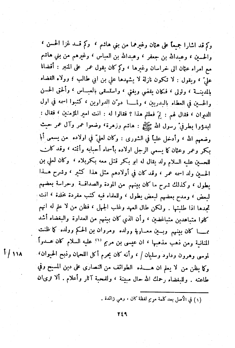 ابدؤوا بطرفي رسول الله صلّى الله عليه وسلم: هاشم وزهرة، وضعوا عمر وآل عمر حيث وضعهم الله، وأدخل عليا في الشورى: وكان لعليّ في اولاده من يسمى أبا بكر وعمر وعثمان كما يسمي الرجل اولاده بأسماء أحبابه وأئمته، وقد كان للحسين عليه السلام ولد يقال له ابو بكر قتل معه بكربلاء، وكان ليلي بن الحسين ولد اسمه عمر، وقد كان في أولادهم مثل هذا كثير، وشرح هذا يطول، وكذلك شرح ما كان بينهم من المودة والصداقة وحراسة بعضهم لبعض، ومدح بعضهم لبعض يطول، وللعلماء فيه كتب مفردة مخلدة، انت تجدها اذا طلبتها. ولكن طال العهد وغلب الجهل، فظن من لا علم له انهم كانوا متباعدين متباغضين، وأن الذي كان بينهم من العداوة والبغضاء أشد مما كان بينهم وبين معاوية وولده ومروان بن الحكم وولده كما ظنت المنانية ومن ذهب مذهبها، ان عيسى بن مريم «1» عليه السلام كان عدوا لموسى وهرون وداود وسليمان/، وأنه كان يحرم أكل اللحمان وذبح الحيوان، وكما يظن من لا يعلم ان هذه الطوائف من النصارى على دين المسيح وفي طاعته. وللبغضاء رحمك الله حال مبينة، وللمحبة آثار وأعلام. ألا ترى ان