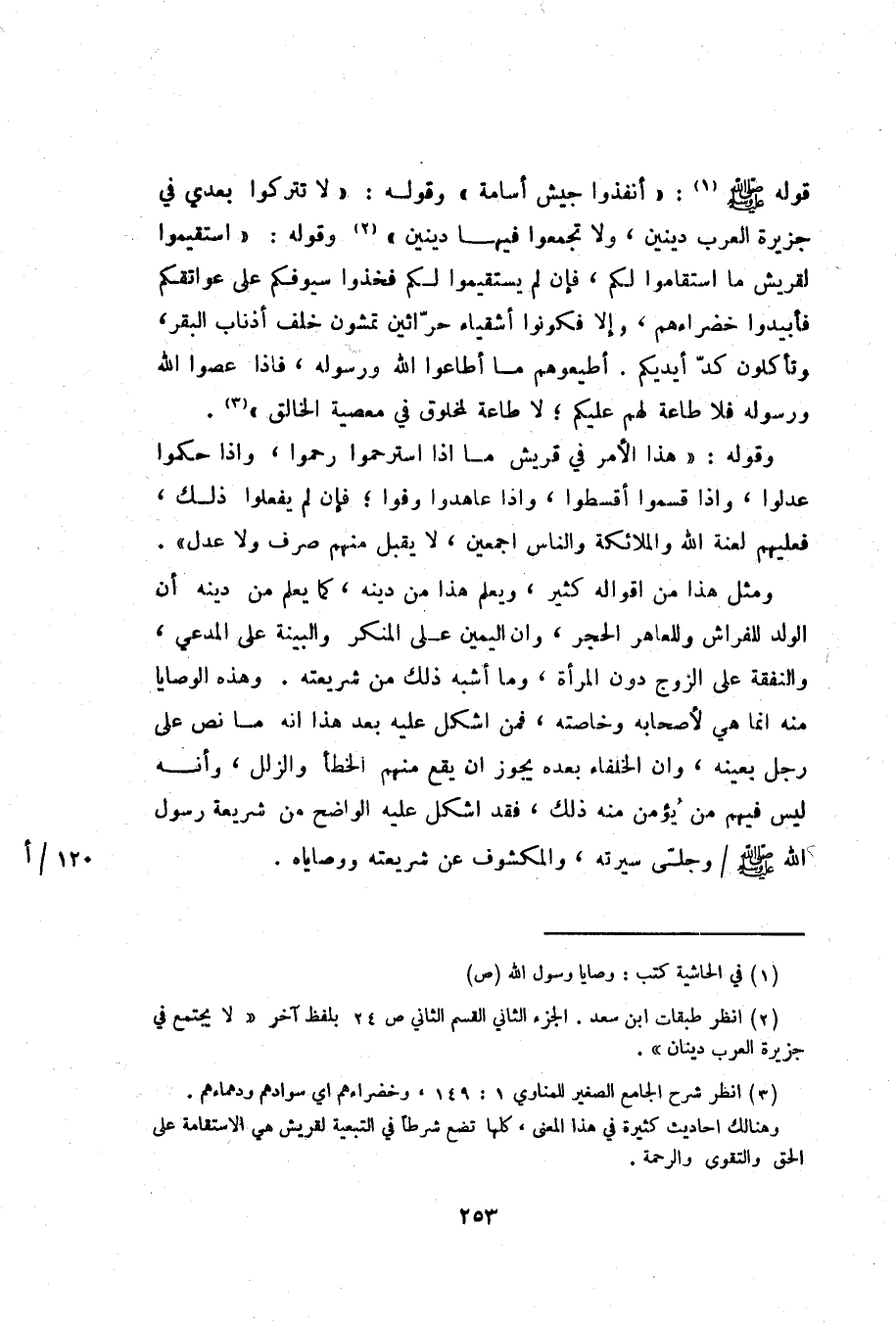 ومثل هذا من اقواله كثير، ويعلم هذا من دينه، كما يعلم من دينه أن الولد للفراش وللعاهر الحجر، وان اليمين على المنكر والبينة على المدعي، والنفقة على الزوج دون المرأة، وما أشبه ذلك من شريعته. وهذه الوصايا منه انما هي لأصحابه وخاصته، فمن اشكل عليه بعد هذا انه ما نص على رجل بعينه، وان الخلفاء بعده يجوز ان يقع منهم الخطأ والزلل، وأنه ليس فيهم من يؤمن منه ذلك، فقد اشكل عليه الواضح من شريعة رسول الله صلّى الله عليه وسلم/ وجلّى سيرته، والمكشوف عن شريعته ووصاياه.