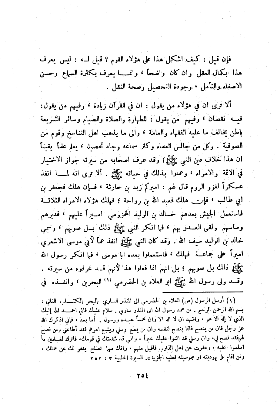 فيه نقصان، وفيهم من يقول: للطهارة والصلاة والصيام وسائر الشريعة باطن يخالف ما عليه الفقهاء والعامة، والى ما يذهب اهل التناسخ وقوم من الصوفية. وكل من جالس العلماء وكثر سماعه وجاد تحصيله، يعلم علما يقينا ان هذا خلاف دين النبي صلّى الله عليه وسلم؛ وقد عرف اصحابه من سيرته جواز الاختيار في الائمة والامراء، وعملوا بذلك في حياته صلّى الله عليه وسلم. ألا ترى انه لما انفذ عسكرا لغزو الروم قال لهم: اميركم زيد بن حارثة، فإن هلك فجعفر بن ابي طالب، فإن هلك فعبد الله بن رواحة؛ فهلك هؤلاء الامراء الثلاثة فاستعمل الجيش بعدهم خالد بن الوليد المخزومي اميرا عليهم، فدبرهم وساسهم ولقى العدو بهم، فما انكر النبي صلّى الله عليه وسلم ذلك بل صوبهم، وسمي خالد بن الوليد سيف الله. وقد كان النبي صلّى الله عليه وسلم انفذ عما لأبي موسى الاشعري اميرا على جماعة فهلك، فاستعملوا بعده ابا موسى، فما انكر رسول الله صلّى الله عليه وسلم ذلك بل صوبهم؛ بل انهم انما فعلوا هذا لأنهم قد عرفوه من سيرته.
