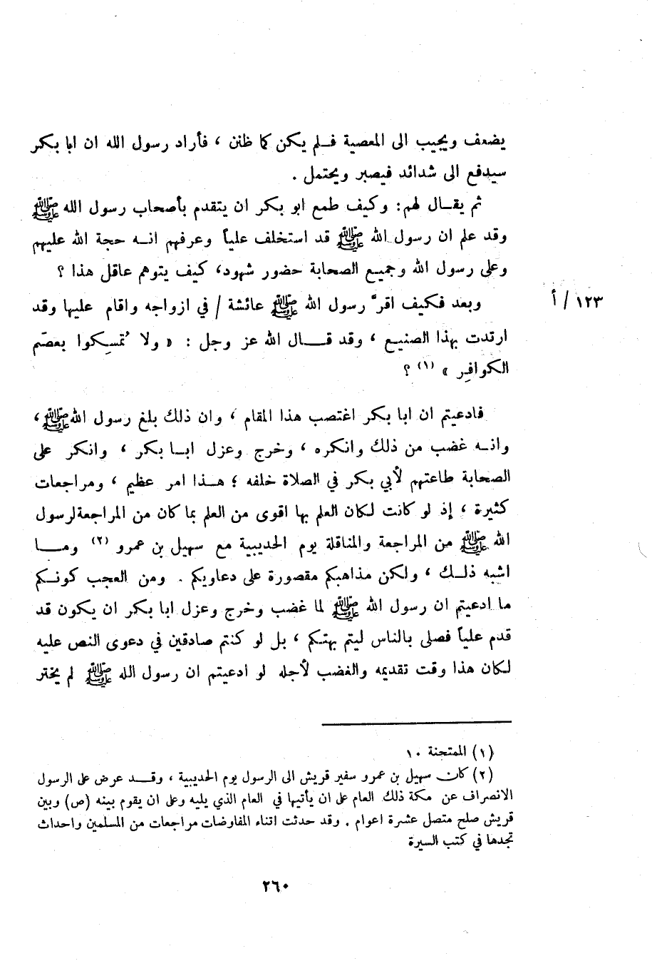 فادعيتم ان ابا بكر اغتصب هذا المقام، وان ذلك بلغ رسول الله صلّى الله عليه وسلم، وانه غضب من ذلك وانكره، وخرج وعزل ابا بكر، وانكر على الصحابة طاعتهم لأبي بكر في الصلاة خلفه؛ هذا امر عظيم، ومراجعات كثيرة، إذ لو كانت لكان العلم بها اقوى من العلم بما كان من المراجعة لرسول الله صلّى الله عليه وسلم من المراجعة والمناقلة يوم الحديبية مع سهيل بن عمرو «2» وما اشبه ذلك، ولكن مذاهبكم مقصورة على دعاويكم. ومن العجب كونكم ما ادعيتم ان رسول الله صلّى الله عليه وسلم لما غضب وخرج وعزل ابا بكر ان يكون قد قدم عليا فصلى بالناس ليتم بهتكم، بل لو كنتم صادقين في دعوى النص عليه لكان هذا وقت تقديمه والغضب لأجله لو ادعيتم ان رسول الله صلّى الله عليه وسلم لم يختر