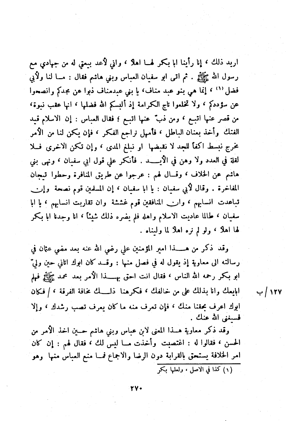 وقد ذكر من هذا امير المؤمنين علي رضي الله عنه بعد مضي عثمان في رسالته الى معاوية إذ يقول له في فصل منها: وقد كان ابوك اتاني حين وليّ ابو بكر رحمه الله الناس، فقال انت احق بهذا الأمر بعد محمد صلّى الله عليه وسلم فهلم ابايعك وانا بذلك على من خالفك، فكرهنا ذلك مخافة الفرقة، / فكان ابوك اعرف بحقنا منك، فإن تعرف منه ما كان يعرف تصب رشدك، وإلا فسيغنى الله عنك.