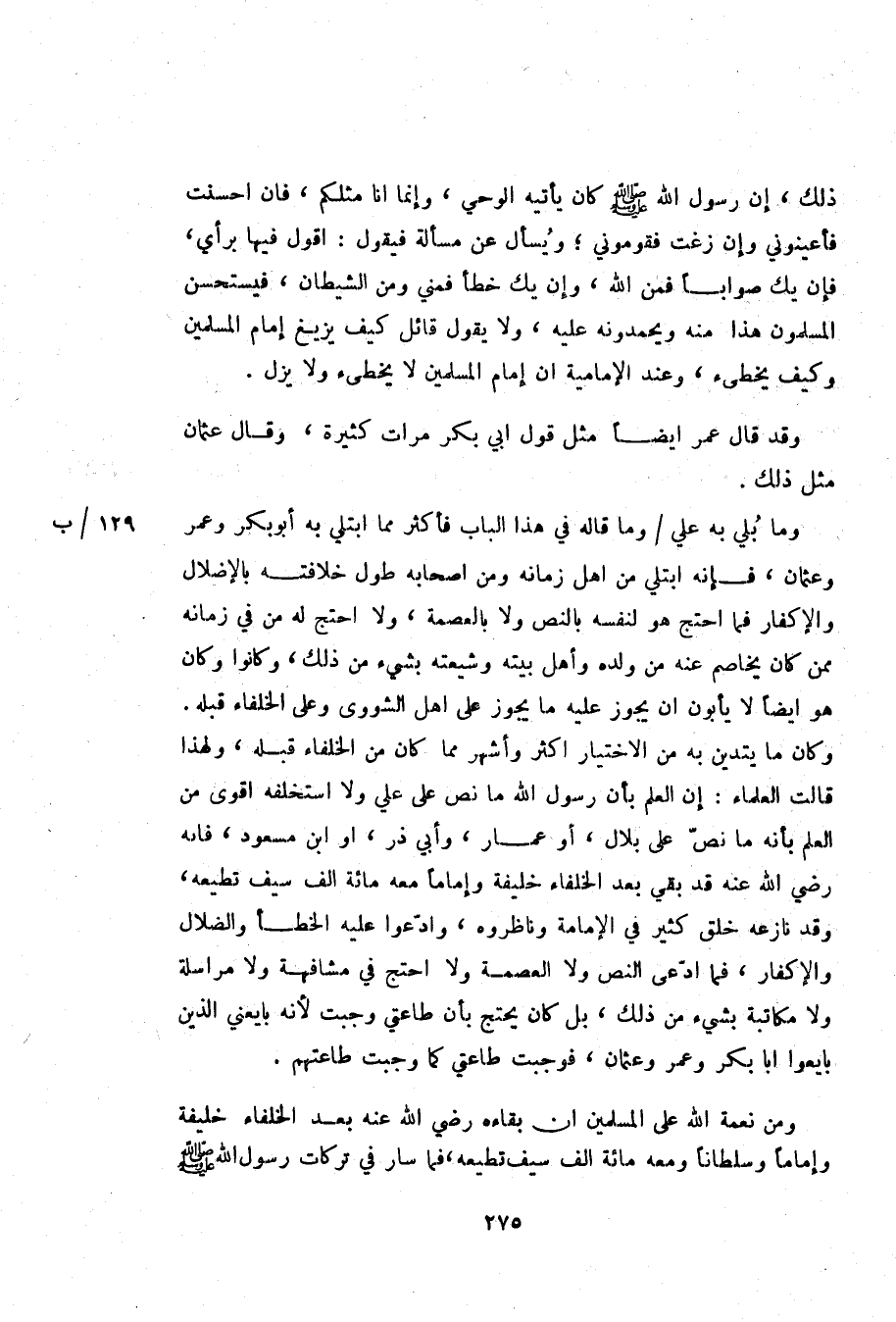 ذلك، إن رسول الله صلّى الله عليه وسلم كان يأتيه الوحي، وإنما انا مثلكم، فان احسنت فأعينوني وإن زغت فقوموني؛ ويسأل عن مسألة فيقول: اقول فيها برأي، فإن يك صوابا فمن الله، وإن يك خطأ فمني ومن الشيطان، فيستحسن المسلمون هذا منه ويحمدونه عليه، ولا يقول قائل كيف يزيغ إمام المسلمين وكيف يخطىء، وعند الإمامية ان إمام المسلمين لا يخطىء ولا يزل.
