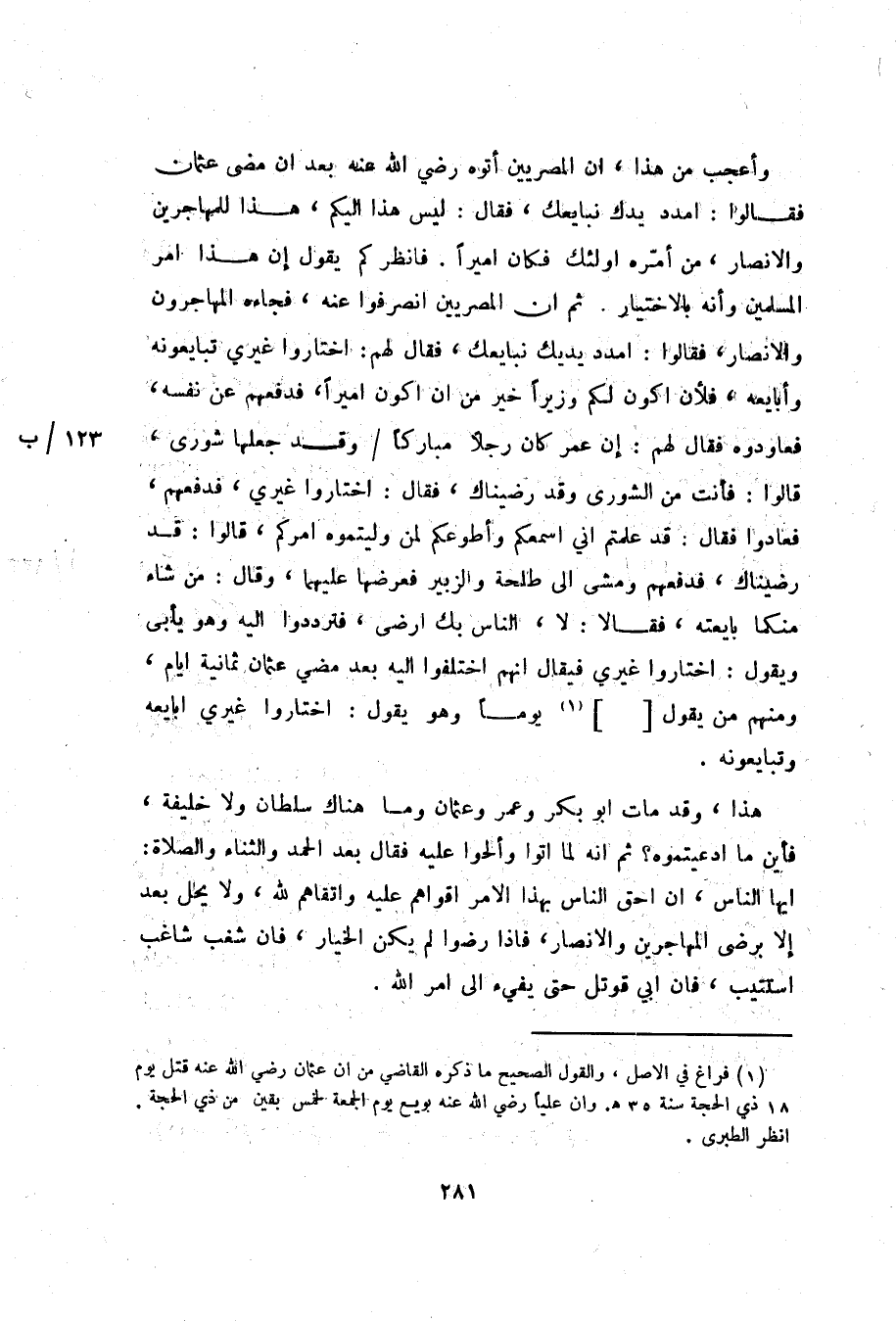 (1) فراغ في الاصل، والقول الصحيح ما ذكره القاضي من ان عثمان رضي الله عنه قتل يوم 18 ذي الحجة سنة 35 هـ. وان عليا رضي الله عنه بويع يوم الجمعة لخمس بقين من ذي الحجة. انظر الطبرى.