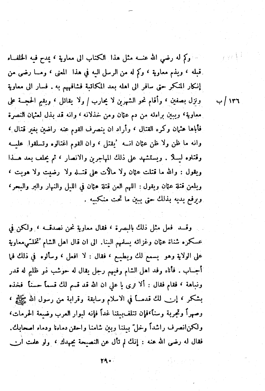 وكم له رضي الله عنه مثل هذا الكتاب الى معاوية، يمدح فيه الخلفاء قبله، ويذم معاوية، وكم له من الرسل اليه في هذا المعنى، وما رضى من إنكار المنكر حتى سافر الى اهله بعد المكاتبة فشافههم به. فسار الى معاوية ونزل بصفين، وأقام نحو الشهرين لا يحارب/ ولا يقاتل، ويقيم الحجة على معاوية، ويبين براءته من دم عثمان ومن خذلانه، وانه قد بذل لعثمان النصرة فأباها عثمان وكره القتال، وأراد ان ينصرف القوم عنه راضين بغير قتال، وانه ما ظن ولا ظن عثمان انه يقتل، وان القوم اغتالوه وتسلقوا عليه وقتلوه ليلا. ويستشهد على ذلك المهاجرين والانصار، ثم يحلف بعد هذا ويقول: والله ما قتلت عثمان ولا مالأت على قتله ولا رضيت ولا هويت، ويلعن قتلة عثمان ويقول: اللهم العن قتلة عثمان في الليل والنهار والبر والبحر، ويرفع يديه بذلك حتى يبين ما تحت منكبيه.