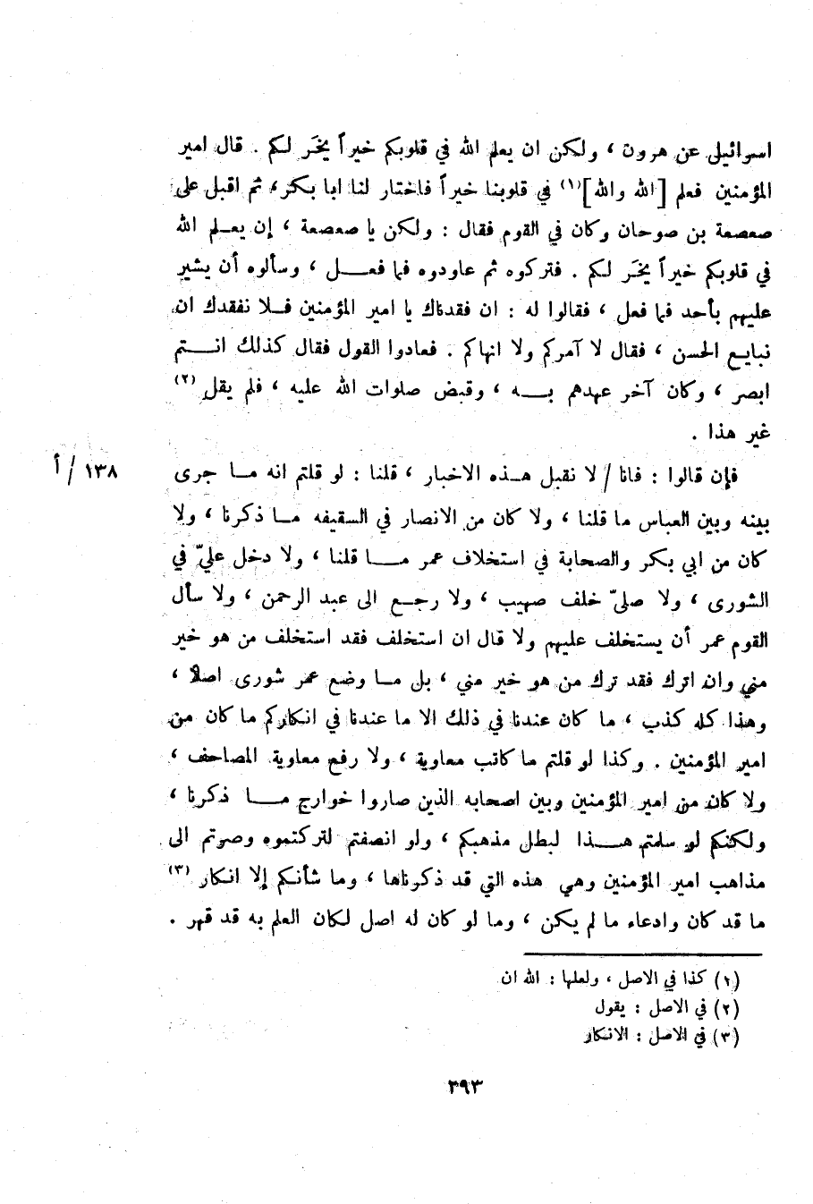 فإن قالوا: فانا/ لا نقبل هذه الاخبار، قلنا: لو قلتم انه ما جرى بينه وبين العباس ما قلنا، ولا كان من الانصار في السقيفه ما ذكرنا، ولا كان من ابي بكر والصحابة في استخلاف عمر ما قلنا، ولا دخل عليّ في الشورى، ولا صلّى خلف صهيب، ولا رجع الى عبد الرحمن، ولا سأل القوم عمر أن يستخلف عليهم ولا قال ان استخلف فقد استخلف من هو خير مني وان اترك فقد ترك من هو خير مني، بل ما وضع عمر شورى اصلا، وهذا كله كذب، ما كان عندنا في ذلك الا ما عندنا في انكاركم ما كان من امير المؤمنين. وكذا لو قلتم ما كاتب معاوية، ولا رفع معاوية المصاحف، ولا كان من امير المؤمنين وبين اصحابه الذين صاروا خوارج ما ذكرنا، ولكنكم لو سلمتم هذا لبطل مذهبكم، ولو انصفتم لتركتموه وصرتم الى مذاهب امير المؤمنين وهي هذه التي قد ذكرناها، وما شأنكم إلا انكار «3» ما قد كان وادعاء ما لم يكن، وما لو كان له اصل لكان العلم به قد قهر.