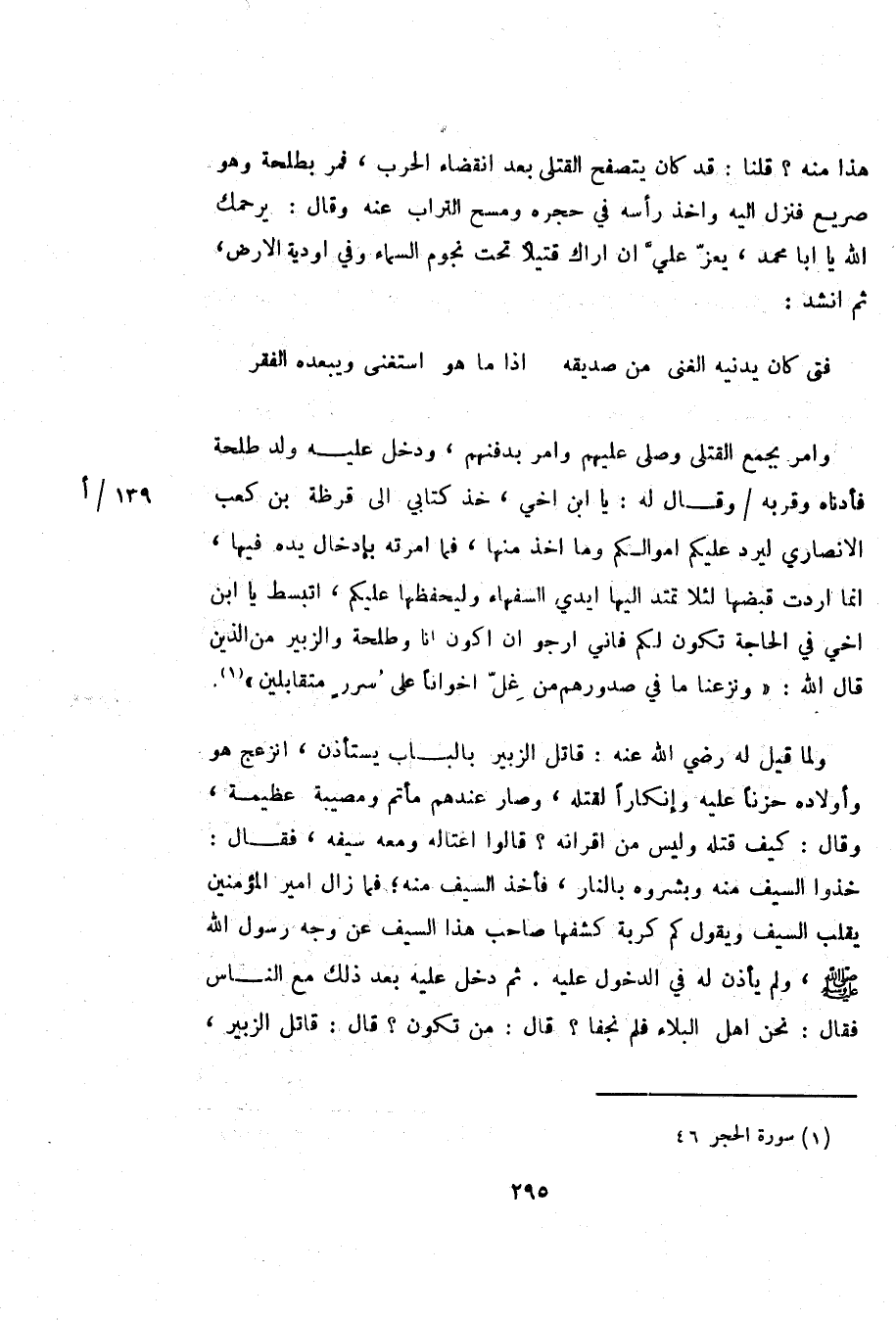 هذا منه؟ قلنا: قد كان يتصفح القتلى بعد انقضاء الحرب، فمر بطلحة وهو صريع فنزل اليه واخذ رأسه في حجره ومسح التراب عنه وقال: يرحمك الله يا ابا محمد، يعزّ عليّ ان اراك قتيلا تحت نجوم السماء وفي اودية الارض، ثم انشد: