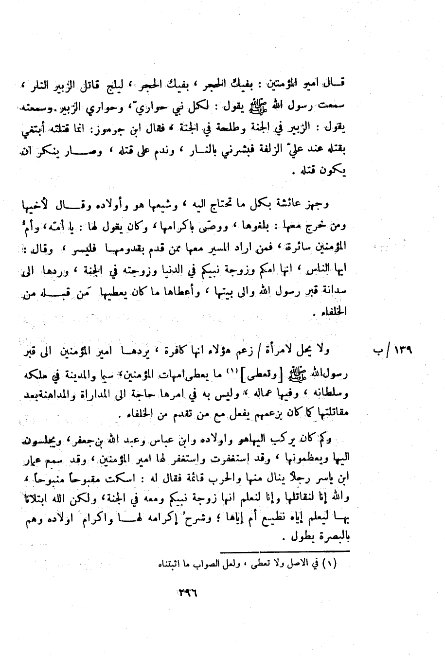 وكم كان يركب اليهاهو واولاده وابن عباس وعبد الله بن جعفر، ويجلسون اليها ويعظمونها، وقد استغفرت واستغفر لها امير المؤمنين، وقد سمع عمار ابن ياسر رجلا ينال منها والحرب قائمة فقال له: اسكت مقبوحا منبوحا، والله إنا لنقاتلها وإنا لنعلم انها زوجة نبيكم ومعه في الجنة، ولكن الله ابتلانا بها ليعلم إياه نطيع أم إياها؛ وشرح إكرامه لها واكرام اولاده وهم بالبصرة يطول.