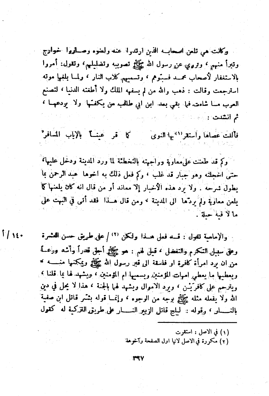 والإمامية تقول: قد فعل هذا ولكن «2» / على طريق حسن العشرة وعلى سبيل التكرم والتفضل، قيل لهم: هو صلّى الله عليه وسلم أجل قدرا وأشد ورعا من ان يرد امرأة كافرة او فاسقة الى قبر رسول الله صلّى الله عليه وسلم ويمكنها منه، ويعطيها ما يعطي امهات المؤمنين ويسميها ام المؤمنين، ويشهد لها بما قلنا، ويترحم على كافرين، ويرد الاموال ويشهد لهما بالجنة، هذا لا يحل في دين الله ولا يفعله مثله صلّى الله عليه وسلم بوجه من الوجوه، وإنما قوله بشّر قاتل ابن صفية بالنار، وقوله: ليلج قاتل الزبير النار على طريق التزكية له كقول
