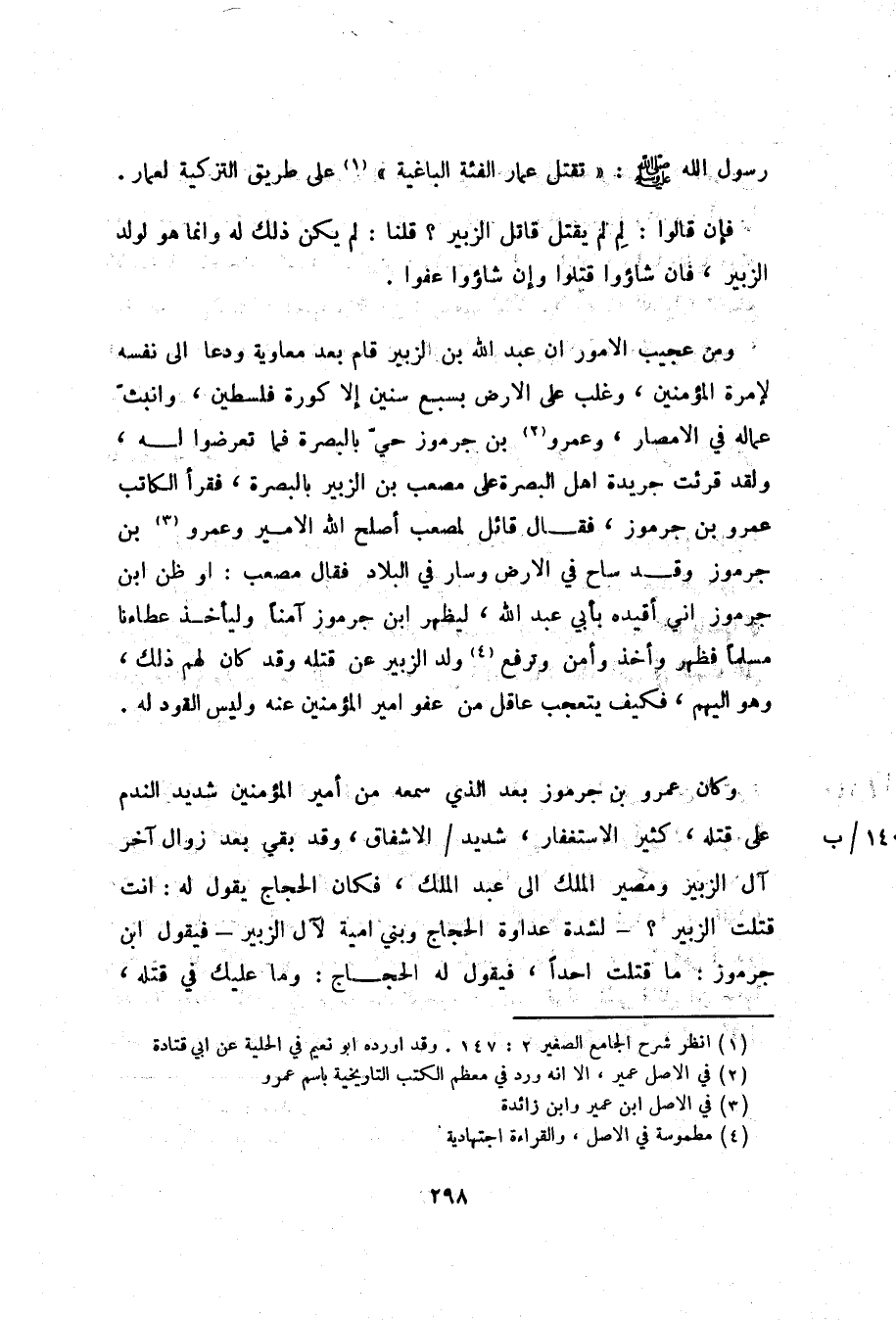 بن جرموز حيّ بالبصرة فما تعرضوا له، ولقد قرئت جريدة اهل البصرة على مصعب بن الزبير بالبصرة، فقرأ الكاتب عمرو بن جرموز، فقال قائل لمصعب أصلح الله الامير وعمرو «3» بن جرموز وقد ساح في الارض وسار في البلاد فقال مصعب: او ظن ابن جرموز اني أقيده بأبي عبد الله، ليظهر ابن جرموز آمنا وليأخذ عطاءنا مسلما فظهر وأخذ وأمن وترفع «4» ولد الزبير عن قتله وقد كان لهم ذلك، وهو اليهم، فكيف يتعجب عاقل من عفو امير المؤمنين عنه وليس القود له.