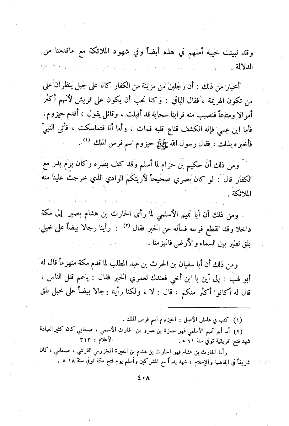 ومن ذلك أن أبا تميم الأسلمي لما رأى الحارث بن هشام يصير إلى مكة داخلا وقد انقطع فرسه فسأله عن الخبر فقال «2» : رأينا رجالا بيضا على خيل بلق تطير بين السماء والأرض فانهزمنا.