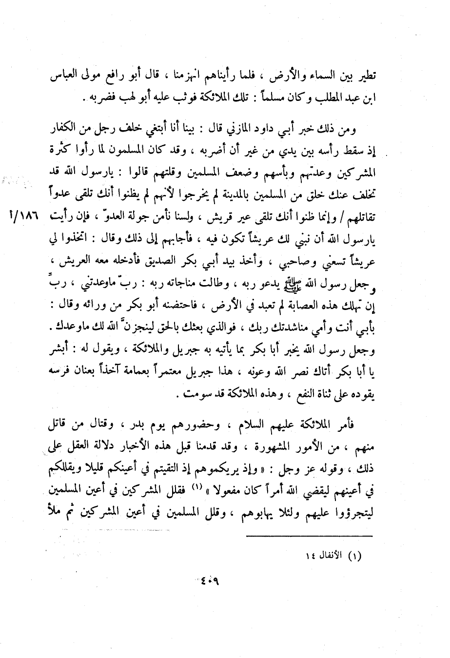 فأمر الملائكة عليهم السلام، وحضورهم يوم بدر، وقتال من قاتل منهم، من الأمور المشهورة، وقد قدمنا قبل هذه الأخبار دلالة العقل على ذلك، وقوله عز وجل: «وَإِذْ يُرِيكُمُوهُمْ إِذِ الْتَقَيْتُمْ فِي أَعْيُنِكُمْ قَلِيلًا وَيُقَلِّلُكُمْ فِي أَعْيُنِهِمْ لِيَقْضِيَ اللَّهُ أَمْراً كانَ مَفْعُولًا» «1» فقلل المشركين في أعين المسلمين ليتجرؤوا عليهم ولئلا يهابوهم، وقلل المسلمين في أعين المشركين ثم ملأ