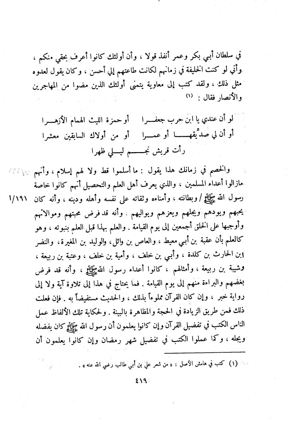 رأت قريش نجم ليلي ظهرا والخصم في زمانك هذا يقول: ما أسلموا قط ولا لهم إسلام، وأنهم ما زالوا أعداء المسلمين، والذي يعرف أهل العلم والتحصيل أنهم كانوا خاصة رسول الله صلّى الله عليه وسلم/ وبطانته، وأمناءه وثقاته على نفسه وأهله ودينه، وأنه كان يحبهم ويودهم ويجلهم ويعزهم ويواليهم. وأنه قد فرض محبتهم وموالاتهم وأوجبها على الخلق أجمعين إلى يوم القيامة. والعلم بهذا قبل العلم بنبوته، وهو كالعلم بأن عقبة بن أبي معيط، والعاص بن وائل، والوليد بن المغيرة، والنضر ابن الحارث بن كلدة، وأبي بن خلف، وأمية بن خلف، وعتبة بن ربيعة، وشيبة بن ربيعة، وأمثالهم، كانوا أعداء رسول الله صلّى الله عليه وسلم، وأنه قد فرض بغضهم والبراءة منهم إلى يوم القيامة. فما يحتاج في هذا إلى تلاوة آية ولا إلى رواية خبر، وإن كان القرآن مملوآ بذلك، والحديث مستفيضا به. فإن فعلت ذلك فمن طريق الزيادة في الحجة والمظاهرة بالبينة. ولحكاية تلك الألفاظ عمل الناس الكتب في تفضيل القرآن وإن كانوا يعلمون أن رسول الله صلّى الله عليه وسلم كان يفضله ويجله، وكما عملوا الكتب في تفضيل شهر رمضان وإن كانوا يعلمون أن