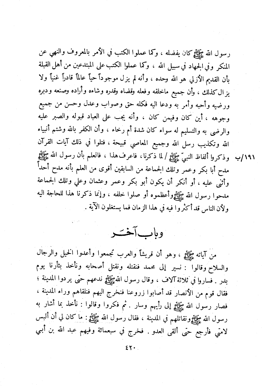 رسول الله صلّى الله عليه وسلم كان يفضله، وكما عملوا الكتب في الأمر بالمعروف والنهي عن المنكر وفي الجهاد في سبيل الله، وكما عملوا الكتب على المبتدعين من أهل القبلة بأن القديم الأزلي هو الله وحده، وأنه لم يزل موجودا حيا عالما قادرا غنيا ولا يزال كذلك، وأن جميع ما خلقه وفعله وقضاه وقدره وشاءه وأراده وصنعه ودبره ورضيه وأحبه وأمر به ودعا اليه فكله حق وصواب وعدل وحسن من جميع وجوهه، أين كان وفيمن كان، وأنه يجب على العباد قبوله والصبر عليه والرضى به والتسليم له سواء كان شدة أم رخاء، وأن الكفر بالله وشتم أنبياء الله وتكذيب رسل الله وجميع المعاصي قبيحة، فتلوا في ذلك آيات القرآن وذكروا ألفاظ النبيّ صلّى الله عليه وسلم/ لما ذكرنا، فاعرف هذا، فالعلم بأن رسول الله صلّى الله عليه وسلم مدح أبا بكر وعمر وتلك الجماعة من السابقين أقوى من العلم بأنه مدح أحدا وأثنى عليه، أو أنكر أن يكون أبو بكر وعمر وعثمان وعلي وتلك الجماعة مدحوا رسول الله صلّى الله عليه وسلم وأعظموه أو صلوا خلفه، وإنما ذكرنا هذا للحاجة اليه ولأن الناس قد أكثروا فيه في هذا الزمان فما يستغلون الآية.