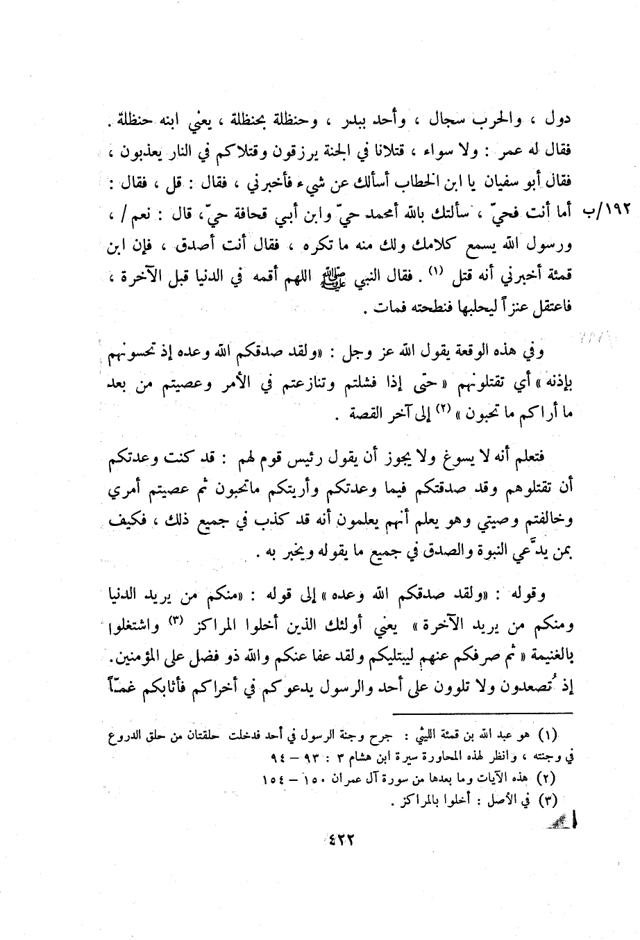 وفي هذه الوقعة يقول الله عز وجل: «وَلَقَدْ صَدَقَكُمُ اللَّهُ وَعْدَهُ إِذْ تَحُسُّونَهُمْ بِإِذْنِهِ» أي تقتلونهم «حَتَّى إِذا فَشِلْتُمْ وَتَنازَعْتُمْ فِي الْأَمْرِ وَعَصَيْتُمْ مِنْ بَعْدِ ما أَراكُمْ ما تُحِبُّونَ» «2» إلى آخر القصة.