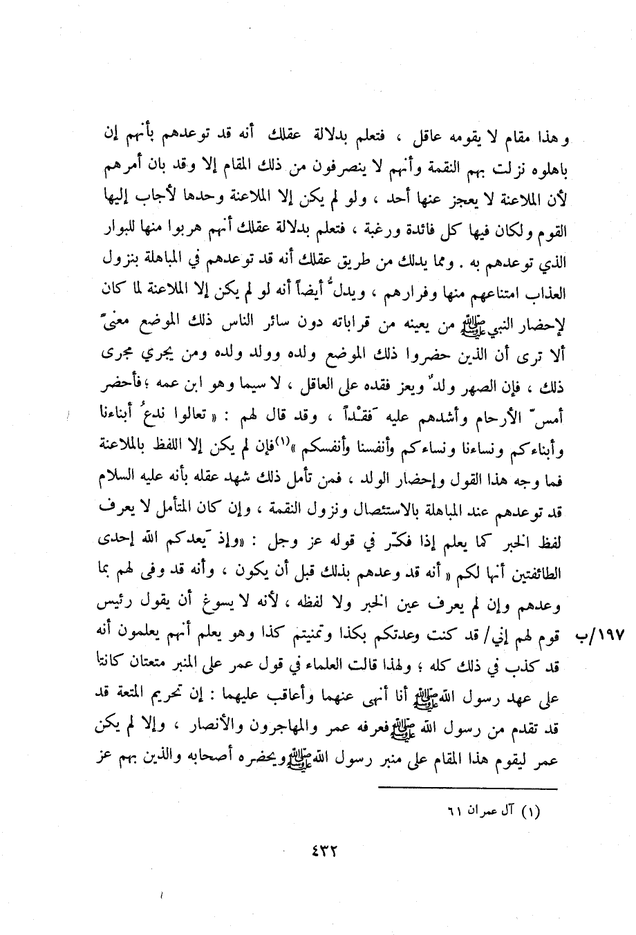 وهذا مقام لا يقومه عاقل، فتعلم بدلالة عقلك أنه قد توعدهم بأنهم إن باهلوه نزلت بهم النقمة وأنهم لا ينصرفون من ذلك المقام إلا وقد بان أمرهم لأن الملاعنة لا يعجز عنها أحد، ولو لم يكن إلا الملاعنة وحدها لأجاب إليها القوم ولكان فيها كل فائدة ورغبة، فتعلم بدلالة عقلك أنهم هربوا منها للبوار الذي توعدهم به. ومما يدلك من طريق عقلك أنه قد توعدهم في المباهلة بنزول العذاب امتناعهم منها وفرارهم، ويدلّ أيضا أنه لو لم يكن إلا الملاعنة لما كان لإحضار النبي صلّى الله عليه وسلم من يعينه من قراباته دون سائر الناس ذلك الموضع معنى ألا ترى أن الذين حضروا ذلك الموضع ولده وولد ولده ومن يجري مجرى ذلك، فإن الصهر ولد ويعز فقده على العاقل، لا سيما وهو ابن عمه؛ فأحضر أمسّ الأرحام وأشدهم عليه فقدا، وقد قال لهم: «تَعالَوْا نَدْعُ أَبْناءَنا وَأَبْناءَكُمْ وَنِساءَنا وَنِساءَكُمْ وَأَنْفُسَنا وَأَنْفُسَكُمْ» «1» فإن لم يكن إلا اللفظ بالملاعنة فما وجه هذا القول وإحضار الولد، فمن تأمل ذلك شهد عقله بأنه عليه السلام قد توعدهم عند المباهلة بالاستئصال ونزول النقمة، وإن كان المتأمل لا يعرف لفظ الخبر كما يعلم إذا فكّر في قوله عز وجل: «وَإِذْ يَعِدُكُمُ اللَّهُ إِحْدَى الطَّائِفَتَيْنِ أَنَّها لَكُمْ» أنه قد وعدهم بذلك قبل أن يكون، وأنه قد وفى لهم بما وعدهم وإن لم يعرف عين الخبر ولا لفظه، لأنه لا يسوغ أن يقول رئيس قوم لهم إني/ قد كنت وعدتكم بكذا وتمنيتم كذا وهو يعلم أنهم يعلمون أنه قد كذب في ذلك كله؛ ولهذا قالت العلماء في قول عمر على المنبر متعتان كانتا على عهد رسول الله صلّى الله عليه وسلم أنا أنهى عنهما وأعاقب عليهما: إن تحريم المتعة قد قد تقدم من رسول الله صلّى الله عليه وسلم فعرفه عمر والمهاجرون والأنصار، وإلا لم يكن عمر ليقوم هذا المقام على منبر رسول الله صلّى الله عليه وسلم ويحضره أصحابه والذين بهم عز