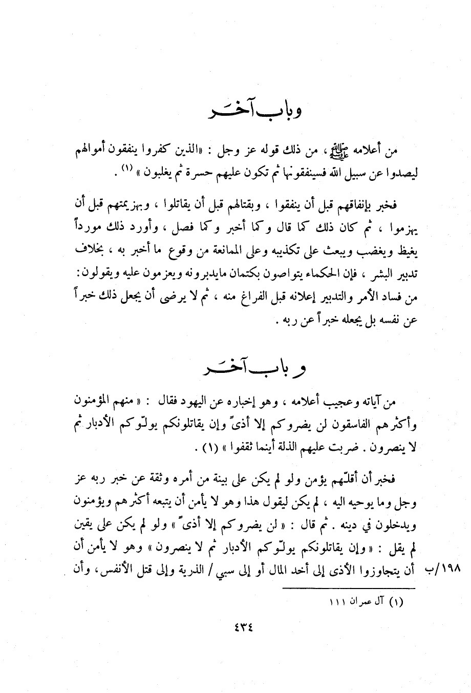 وباب آخر [حول الآية «الَّذِينَ كَفَرُوا يُنْفِقُونَ أَمْوالَهُمْ لِيَصُدُّوا عَنْ سَبِيلِ اللَّهِ فَسَيُنْفِقُونَها ثُمَّ تَكُونُ عَلَيْهِمْ حَسْرَةً ثُمَّ يُغْلَبُونَ» ]