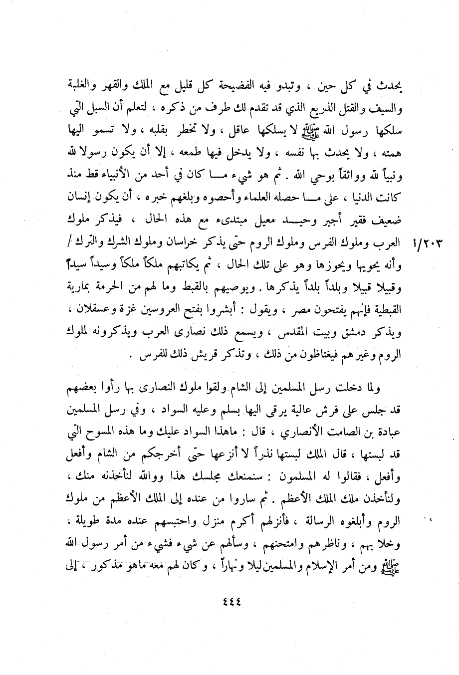 يحدث في كل حين، وتبدو فيه الفضيحة كل قليل مع الملك والقهر والغلبة والسيف والقتل الذريع الذي قد تقدم لك طرف من ذكره، لتعلم أن السبل التي سلكها رسول الله صلّى الله عليه وسلم لا يسلكها عاقل، ولا تخطر بقلبه، ولا تسمو اليها همته، ولا يحدث بها نفسه، ولا يدخل فيها طمعه، إلا أن يكون رسولا لله ونبيا لله وواثقا بوحي الله. ثم هو شيء ما كان في أحد من الأنبياء قط منذ كانت الدنيا، على ما حصله العلماء وأحصوه وبلغهم خبره، أن يكون إنسان ضعيف فقير أجير وحيد معيل مبتدىء مع هذه الحال، فيذكر ملوك العرب وملوك الفرس وملوك الروم حتى يذكر خراسان وملوك الشرك والترك/ وأنه يحويها ويحوزها وهو على تلك الحال، ثم يكاتبهم ملكا ملكا وسيدا سيدا وقبيلا قبيلا وبلدا بلدا يذكرها. ويوصيهم بالقبط وما لهم من الحرمة بمارية القبطية فإنهم يفتحون مصر، ويقول: أبشروا بفتح العروسين غزة وعسقلان، ويذكر دمشق وبيت المقدس، ويسمع ذلك نصارى العرب ويذكرونه لملوك الروم وغيرهم فيغتاظون من ذلك، وتذكر قريش ذلك للفرس.