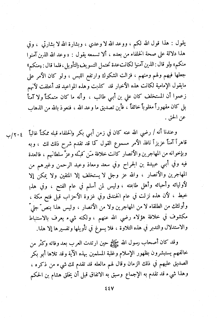 يقول: هذا قول الله لكم، ووعد الله لا وعدي، وبشارة الله لا بشارتي، وفي هذا دلالة على صحة الخلفاء من بعده، ألا تسمعه يقول: «وَعَدَ اللَّهُ الَّذِينَ آمَنُوا مِنْكُمْ» ولو قال: الذين آمنوا لكانت عدة تحتمل التسويف والتأويل، فلما قال: «منكم» جعلها فيهم ولهم ومنهم، فزالت الشكوك وارتفع اللبس، ولو كان الأمر على ما يقول الإمامية لكانت هذه الأخبار قد كذبت وهذه المواعيد قد أخلفت لأنهم زعموا أن المستخلف كان علي بن أبي طالب، وأنه ما كان متمكنا ولا آمنا بل كان مقهورا مغلوبا خائفا، فأين تصديق ما وعد الله، فنعوذ بالله من الذهاب عن الحق.