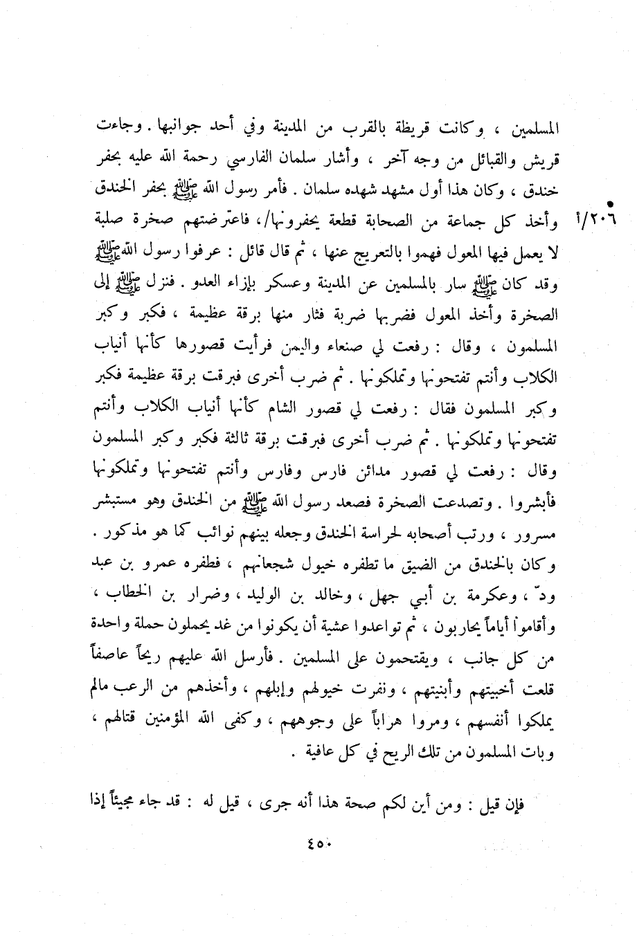 المسلمين، وكانت قريظة بالقرب من المدينة وفي أحد جوانبها. وجاءت قريش والقبائل من وجه آخر، وأشار سلمان الفارسي رحمة الله عليه بحفر خندق، وكان هذا أول مشهد شهده سلمان. فأمر رسول الله صلّى الله عليه وسلم بحفر الخندق وأخذ كل جماعة من الصحابة قطعة يحفرونها/، فاعترضتهم صخرة صلبة لا يعمل فيها المعول فهموا بالتعريج عنها، ثم قال قائل: عرفوا رسول الله صلّى الله عليه وسلم وقد كان صلّى الله عليه وسلم سار بالمسلمين عن المدينة وعسكر بإزاء العدو. فنزل صلّى الله عليه وسلم إلى الصخرة وأخذ المعول فضربها ضربة فثار منها برقة عظيمة. فكبر وكبر المسلمون، وقال: رفعت لي صنعاء واليمن فرأيت قصورها كأنها أنياب الكلاب وأنتم تفتحونها وتملكونها. ثم ضرب أخرى فبرقت برقة عظيمة فكبر وكبر المسلمون فقال: رفعت لي قصور الشام كأنها أنياب الكلاب وأنتم تفتحونها وتملكونها. ثم ضرب أخرى فبرقت برقة ثالثة فكبر وكبر المسلمون وقال: رفعت لي قصور مدائن فارس وفارس وأنتم تفتحونها وتملكونها فأبشروا. وتصدعت الصخرة فصعد رسول الله صلّى الله عليه وسلم من الخندق وهو مستبشر مسرور، ورتب أصحابه لحراسة الخندق وجعله بينهم نوائب كما هو مذكور.