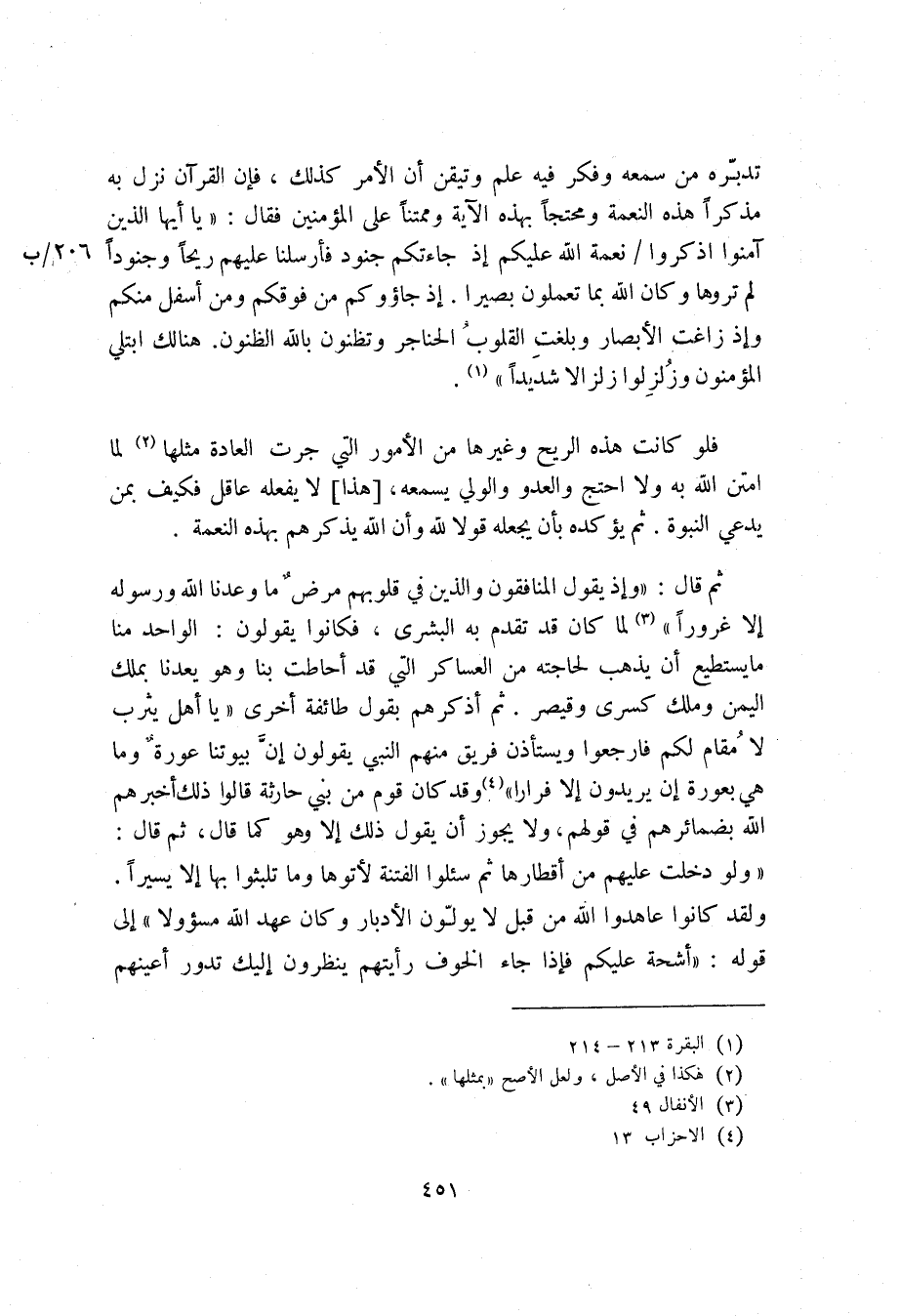 تدبّره من سمعه وفكر فيه علم وتيقن أن الأمر كذلك، فإن القرآن نزل به مذكرا هذه النعمة ومحتجا بهذه الآية وممتنا على المؤمنين فقال: «يا أَيُّهَا الَّذِينَ آمَنُوا اذْكُرُوا نِعْمَةَ اللَّهِ عَلَيْكُمْ إِذْ جاءَتْكُمْ جُنُودٌ فَأَرْسَلْنا عَلَيْهِمْ رِيحاً وَجُنُوداً لَمْ تَرَوْها وَكانَ اللَّهُ بِما تَعْمَلُونَ بَصِيراً. إِذْ جاؤُكُمْ مِنْ فَوْقِكُمْ وَمِنْ أَسْفَلَ مِنْكُمْ وَإِذْ زاغَتِ الْأَبْصارُ وَبَلَغَتِ الْقُلُوبُ الْحَناجِرَ وَتَظُنُّونَ بِاللَّهِ الظُّنُونَا. هُنالِكَ ابْتُلِيَ الْمُؤْمِنُونَ وَزُلْزِلُوا زِلْزالًا شَدِيداً» «1»