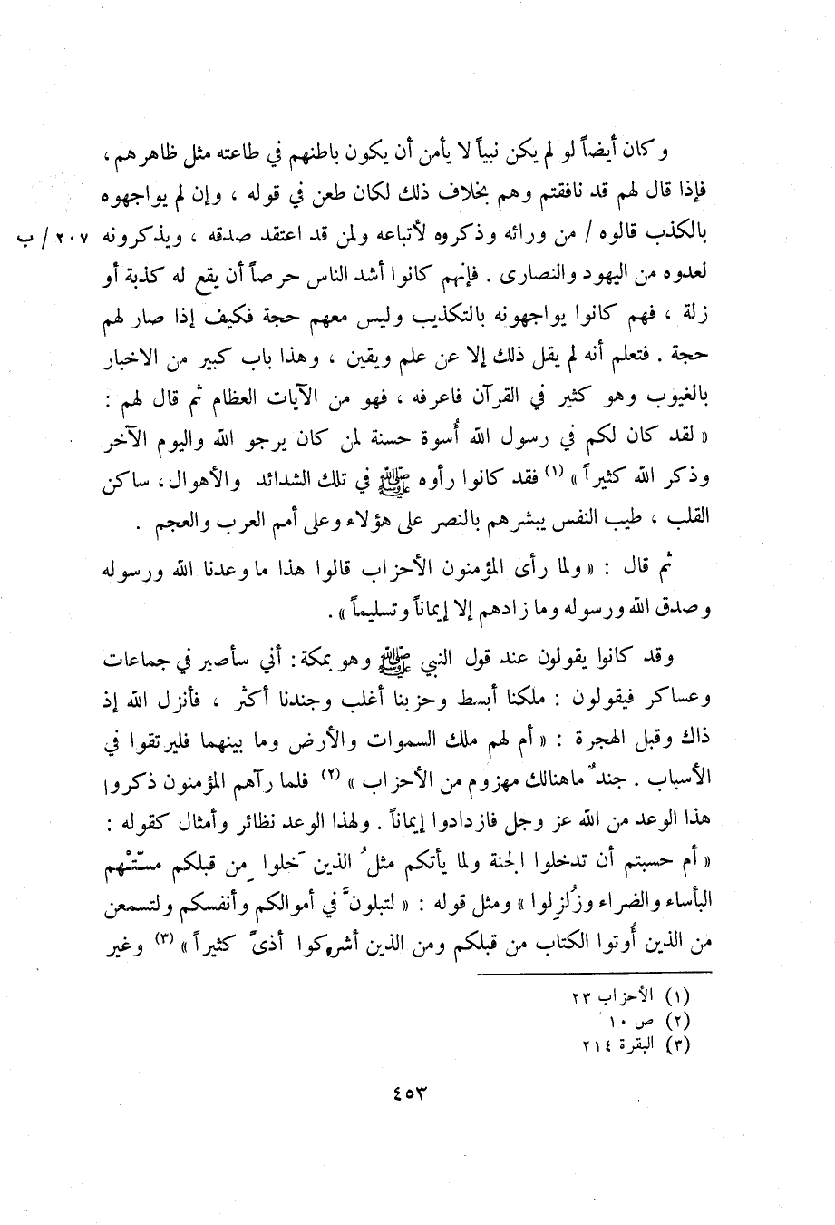 «لَقَدْ كانَ لَكُمْ فِي رَسُولِ اللَّهِ أُسْوَةٌ حَسَنَةٌ لِمَنْ كانَ يَرْجُوا اللَّهَ وَالْيَوْمَ الْآخِرَ وَذَكَرَ اللَّهَ كَثِيراً» «1» فقد كانوا رأوه صلّى الله عليه وسلم في تلك الشدائد والأهوال، ساكن القلب، طيب النفس يبشرهم بالنصر على هؤلاء وعلى أمم العرب والعجم.