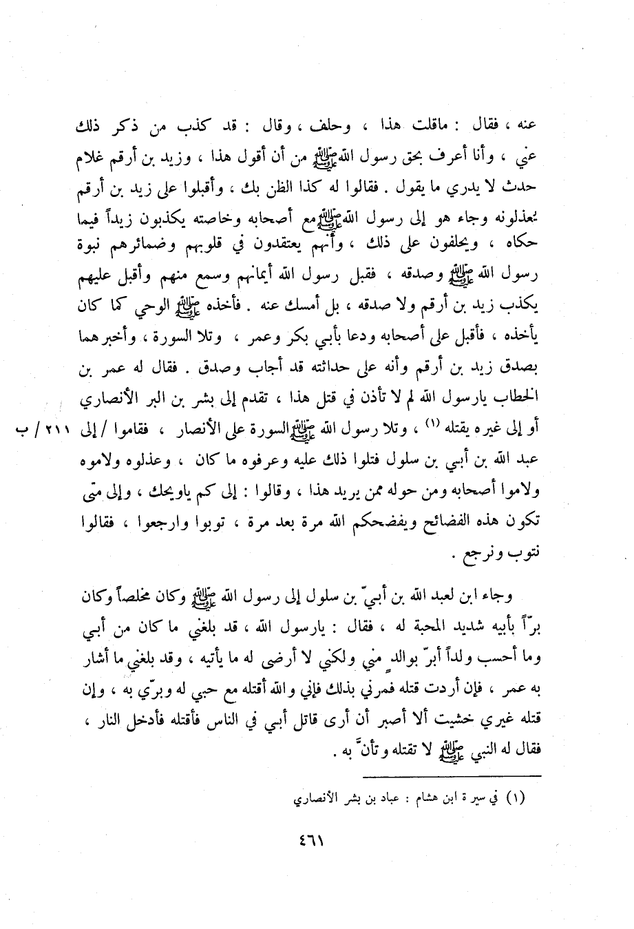 عنه، فقال: ما قلت هذا، وحلف، وقال: قد كذب من ذكر ذلك عني، وأنا أعرف بحق رسول الله صلّى الله عليه وسلم من أن أقول هذا، وزيد بن أرقم غلام حدث لا يدري ما يقول. فقالوا له كذا الظن بك، وأقبلوا على زيد بن أرقم تعذلونه وجاء هو إلى رسول الله صلّى الله عليه وسلم مع أصحابه وخاصته يكذبون زيدا فيما حكاه، ويحلفون على ذلك، وأنهم يعتقدون في قلوبهم وضمائرهم نبوة رسول الله صلّى الله عليه وسلم وصدقه، فقبل رسول الله أيمانهم وسمع منهم وأقبل عليهم يكذب زيد بن أرقم ولا صدقه، بل أمسك عنه. فأخذه صلّى الله عليه وسلم الوحي كما كان يأخذه، فأقبل على أصحابه ودعا بأبي بكر وعمر، وتلا السورة، وأخبرهما بصدق زيد بن أرقم وأنه على حداثته قد أجاب وصدق. فقال له عمر بن الخطاب يا رسول الله لم لا تأذن في قتل هذا، تقدم إلى بشر بن البر الأنصاري أو إلى غيره يقتله «1» ، وتلا رسول الله صلّى الله عليه وسلم السورة على الأنصار، فقاموا/ إلى عبد الله بن أبي بن سلول فتلوا ذلك عليه وعرفوه ما كان، وعذلوه ولاموه ولاموا أصحابه ومن حوله ممن يريد هذا، وقالوا: إلى كم يا ويحك، وإلى متى تكون هذه الفضائح ويفضحكم الله مرة بعد مرة، توبوا وارجعوا، فقالوا نتوب ونرجع.