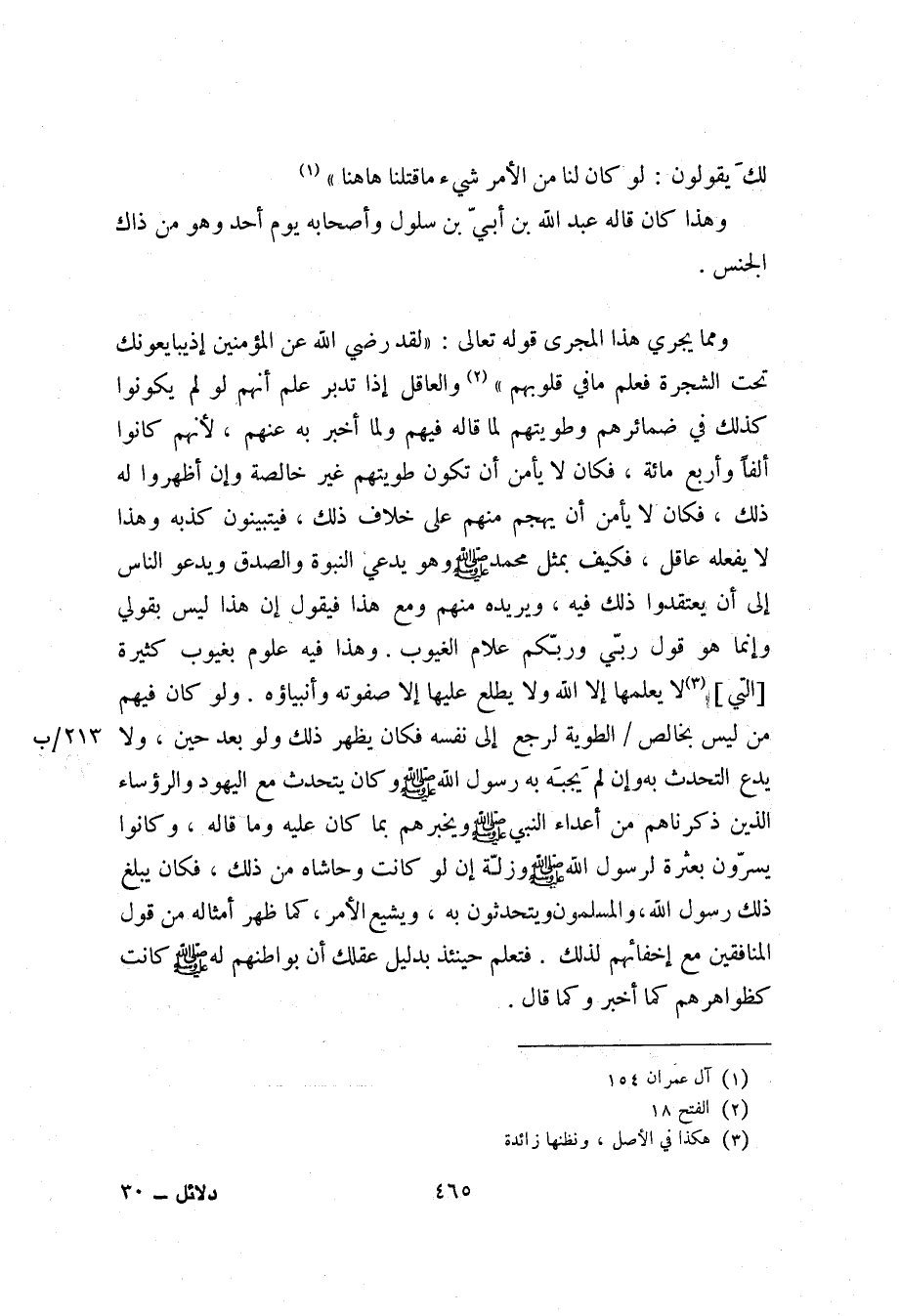 ومما يجري هذا المجرى قوله تعالى: «لَقَدْ رَضِيَ اللَّهُ عَنِ الْمُؤْمِنِينَ إِذْ يُبايِعُونَكَ تَحْتَ الشَّجَرَةِ فَعَلِمَ ما فِي قُلُوبِهِمْ» «2» والعاقل إذا تدبر علم أنهم لو لم يكونوا كذلك في ضمائرهم وطويتهم لما قاله فيهم ولما أخبر به عنهم، لأنهم كانوا ألفا وأربع مائة، فكان لا يأمن أن تكون طويتهم غير خالصة وإن أظهروا له ذلك، فكان لا يأمن أن يهجم منهم على خلاف ذلك، فيتبينون كذبه وهذا لا يفعله عاقل، فكيف بمثل محمد صلّى الله عليه وسلم وهو يدعي النبوة والصدق ويدعو الناس إلى أن يعتقدوا ذلك فيه، ويريده منهم ومع هذا فيقول إن هذا ليس بقولي وإنما هو قول ربّي وربّكم علام الغيوب. وهذا فيه علوم بغيوب كثيرة [التي] ، «3» لا يعلمها إلا الله ولا يطلع عليها إلا صفوته وأنبياؤه. ولو كان فيهم من ليس بخالص/ الطوية لرجع إلى نفسه فكان يظهر ذلك ولو بعد حين، ولا يدع التحدث به وإن لم يجبه به رسول الله صلّى الله عليه وسلم وكان يتحدث مع اليهود والرؤساء الذين ذكرناهم من أعداء النبي صلّى الله عليه وسلم ويخبرهم بما كان عليه وما قاله، وكانوا يسرّون بعثرة لرسول الله صلّى الله عليه وسلم وزلّة إن لو كانت وحاشاه من ذلك، فكان يبلغ ذلك رسول الله، والمسلمون ويتحدثون به، ويشيع الأمر، كما ظهر أمثاله من قول المنافقين مع إخفائهم لذلك. فتعلم حينئذ بدليل عقلك أن بواطنهم له صلّى الله عليه وسلم كانت كظواهرهم كما أخبر وكما قال.